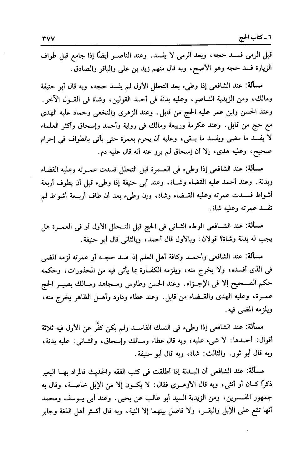مَسْأَلَةٌ: عِنْدَ الشَّافِعِيِّ إذا وطئ بعد التحلل الأول لم يفسد حجه، وبه قال أبو حَنِيفَةَ ومالك، ومن الزَّيْدِيَّة النَّاصِر، وعليه بدنة في أحد القولين، وشاة في القول الآخر. وعند الحسن وابن عمر عليه الحج من قابل. وعند الزُّهْرِيّ والنَّخَعِيّ وحماد عليه الهدْي مع حج من قابل. وعند عكرمة ورَبِيعَة وَمَالِك في رِوَايَة وَأَحْمَد وإِسْحَاق وأَكْثَر الْعُلَمَاءِ لا يفسد ما مضى ويفسد ما بقي، وعليه أن يحرم بعمرة حتى يأتي بالطواف في إحرام صحيح، وعليه هدْي، إلا أن إِسْحَاق لم يرو عنه أنه قال عليه دم.