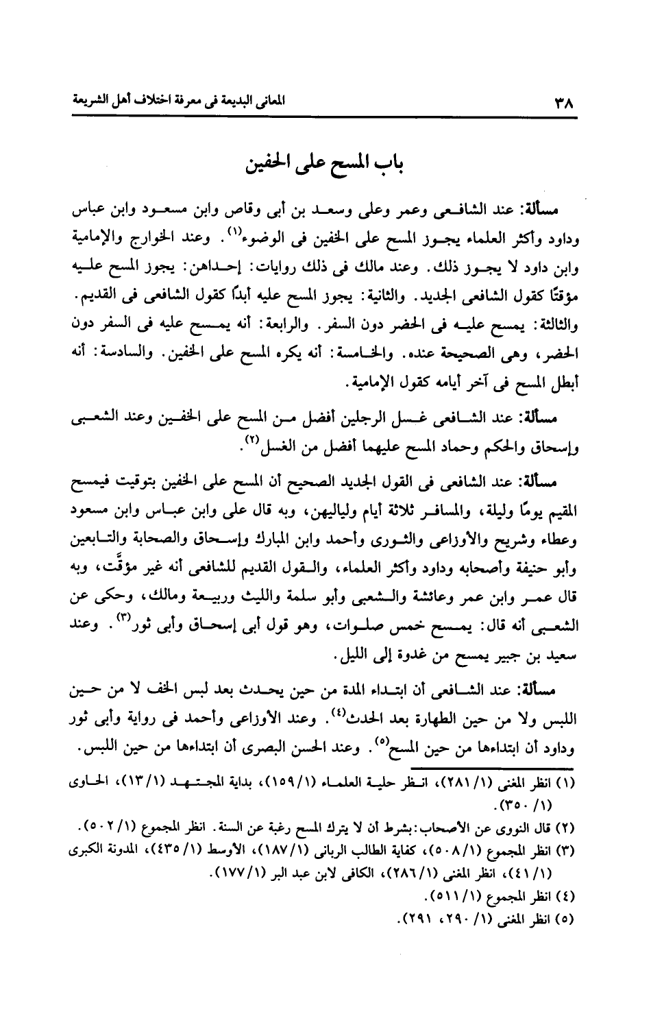 مَسْأَلَةٌ: عِنْدَ الشَّافِعِيِّ وعمر وعلي وسعد بن أبي وقاص وابن مسعود وابن عباس وداود وأَكْثَر الْعُلَمَاءِ يجوز المسح على الخفين في الوضوء. وعند الخوارج والْإِمَامِيَّة وابن داود لا يجوز ذلك. وعند مالك في ذلك روايات: إحداهن: يجوز المسح عليه مؤقتًا كقول الشَّافِعِيّ الجديد. والثانية: يجوز المسح عليه أبدًا كقول الشَّافِعِيّ في القديم. والثالثة: يمسح عليه في الحضر دون السفر. والرابعة: أنه يمسح عليه في السفر دون الحضر، وهي الصحيحة عنده. والخامسة: أنه يكره المسح على الخفين. والسادسة: أنه أبطل المسح في آخر أيامه كقول الْإِمَامِيَّة.