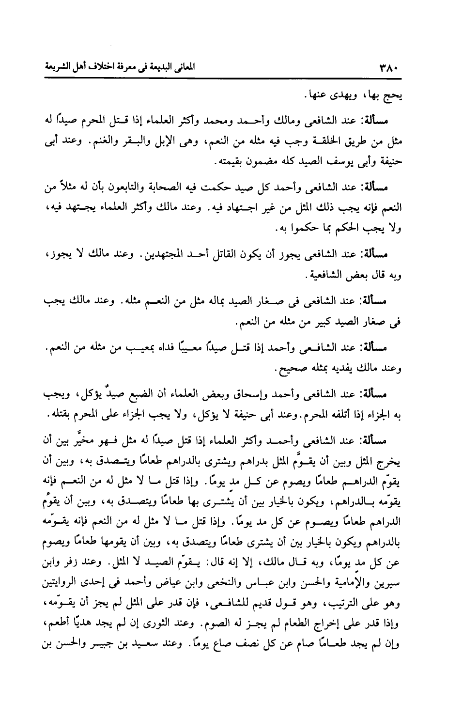 مَسْأَلَةٌ: عِنْدَ الشَّافِعِيِّ وَأَحْمَدَ كل صيد حكمت فيه الصحابة والتابعون بأن له مثلاً من النعم فإنه يجب ذلك الثل من غير اجتهاد فيه. وعند مالك وأَكْثَر الْعُلَمَاءِ يجتهد فيه، ولا يجب الحكم بما حكموا به.