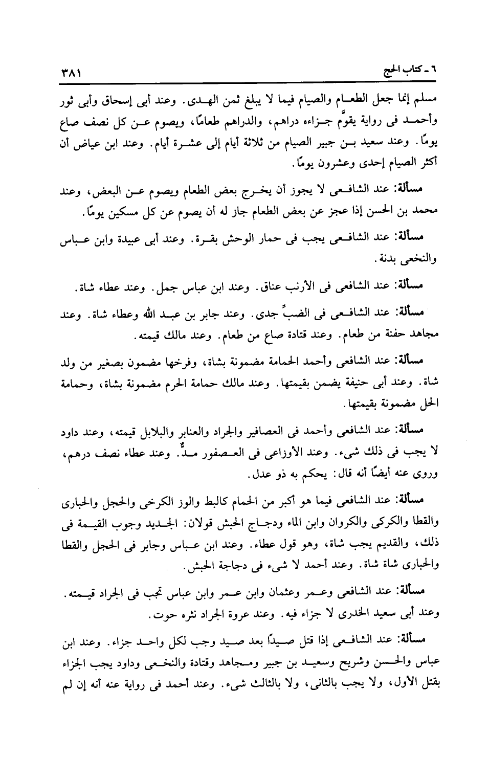 مَسْأَلَةٌ: عِنْدَ الشَّافِعِيِّ إذا قتل صيدًا بعد صيد وجب لكل واحد جزاء. وعند ابن عبَّاس والحسن وشريح وسعيد بن جبير ومجاهد وقتادة والنَّخَعِيّ وداود يجب الجزاء بقتل الأول، ولا يجب بالثاني، ولا بالثالث شيء. وعند أَحْمَد في رِوَايَة عنه أنه إن لم