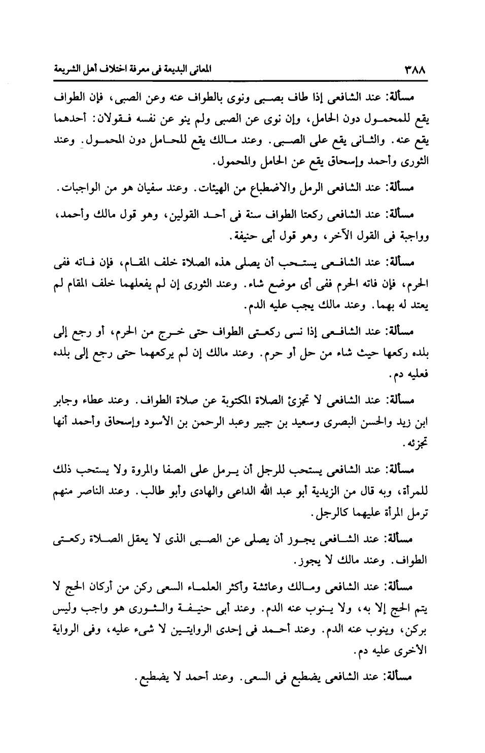 مَسْأَلَةٌ: عِنْدَ الشَّافِعِيِّ وَمَالِك وعائشة وأَكْثَر الْعُلَمَاءِ السعي ركن من أركان الحج لا يتم الحج إلا به، ولا ينوب عنه الدم. وعند أَبِي حَنِيفَةَ والثَّوْرِيّ هو واجب وليس بركن، وينوب عنه الدم. وعند أَحْمَد في إحدى الروايتين لا شيء عليه، وفي الرِوَايَة الأخرى عليه دم.