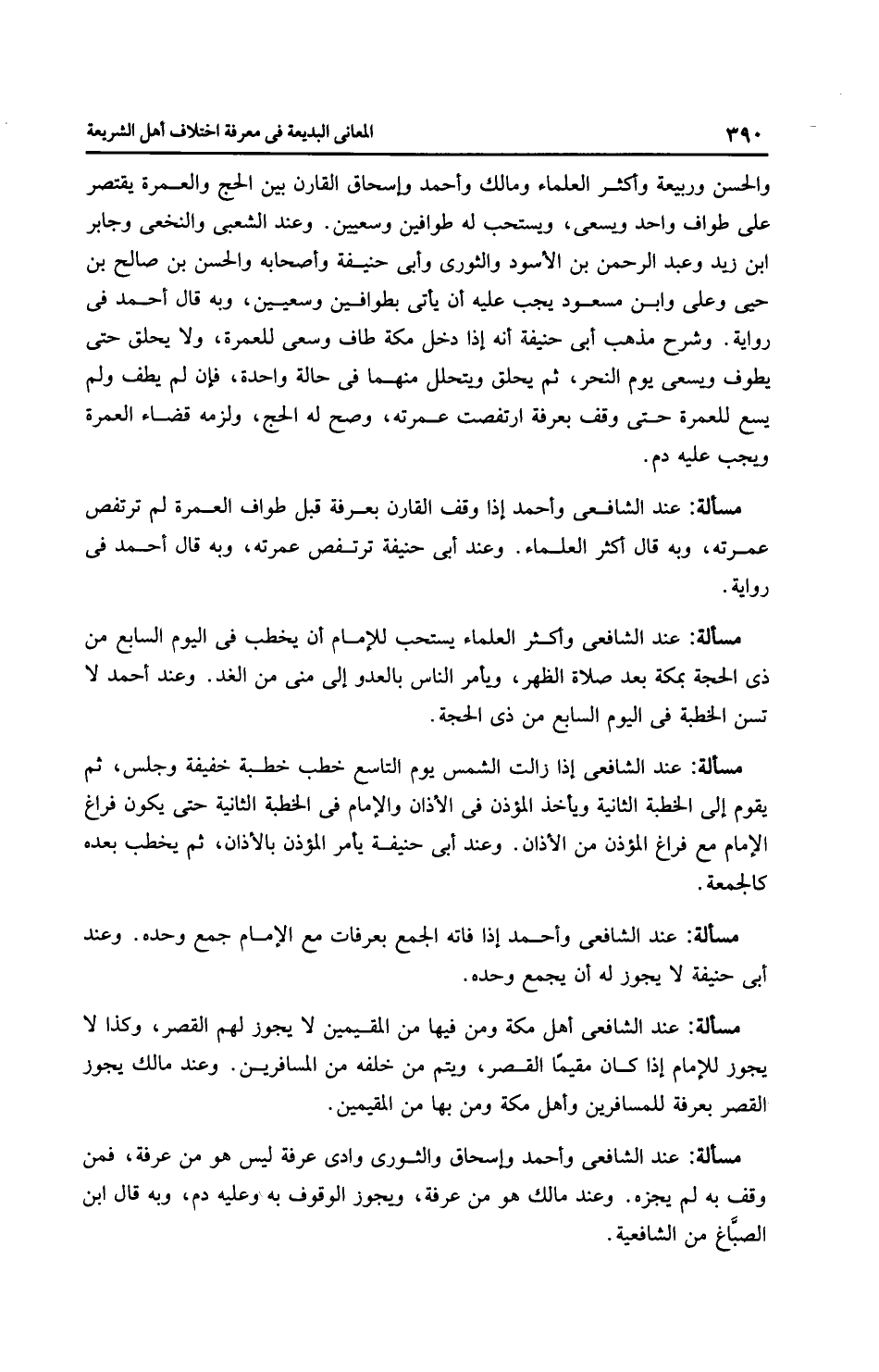 مَسْأَلَةٌ: عِنْدَ الشَّافِعِيِّ وَأَحْمَدَ وإِسْحَاق والثَّوْرِيّ وادي عرفة ليس هو من عرفة، فمن وقف به لم يجزه. وعند مالك هو من عرفة، ويجوز الوقوف به وعليه دم، وبه قال ابن الصبَّاغ من الشَّافِعِيَّة.