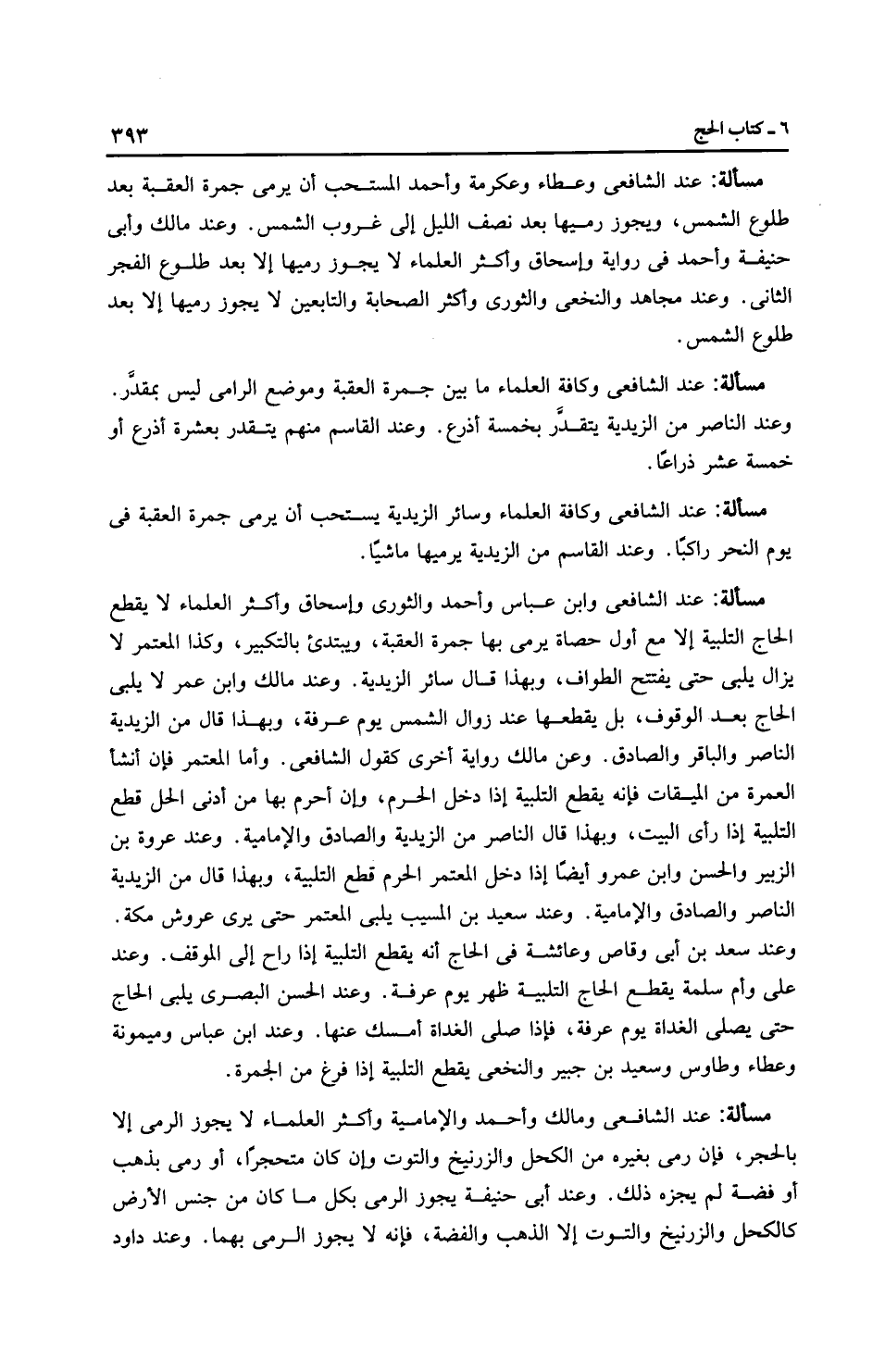 مَسْأَلَةٌ: عِنْدَ الشَّافِعِيِّ وكافة العلماء وسائر الزَّيْدِيَّة يستحب أن يرمي جمرة العقبة في يوم النحر راكبًا. وعند القاسم من الزَّيْدِيَّة يرميها ماشيًا.