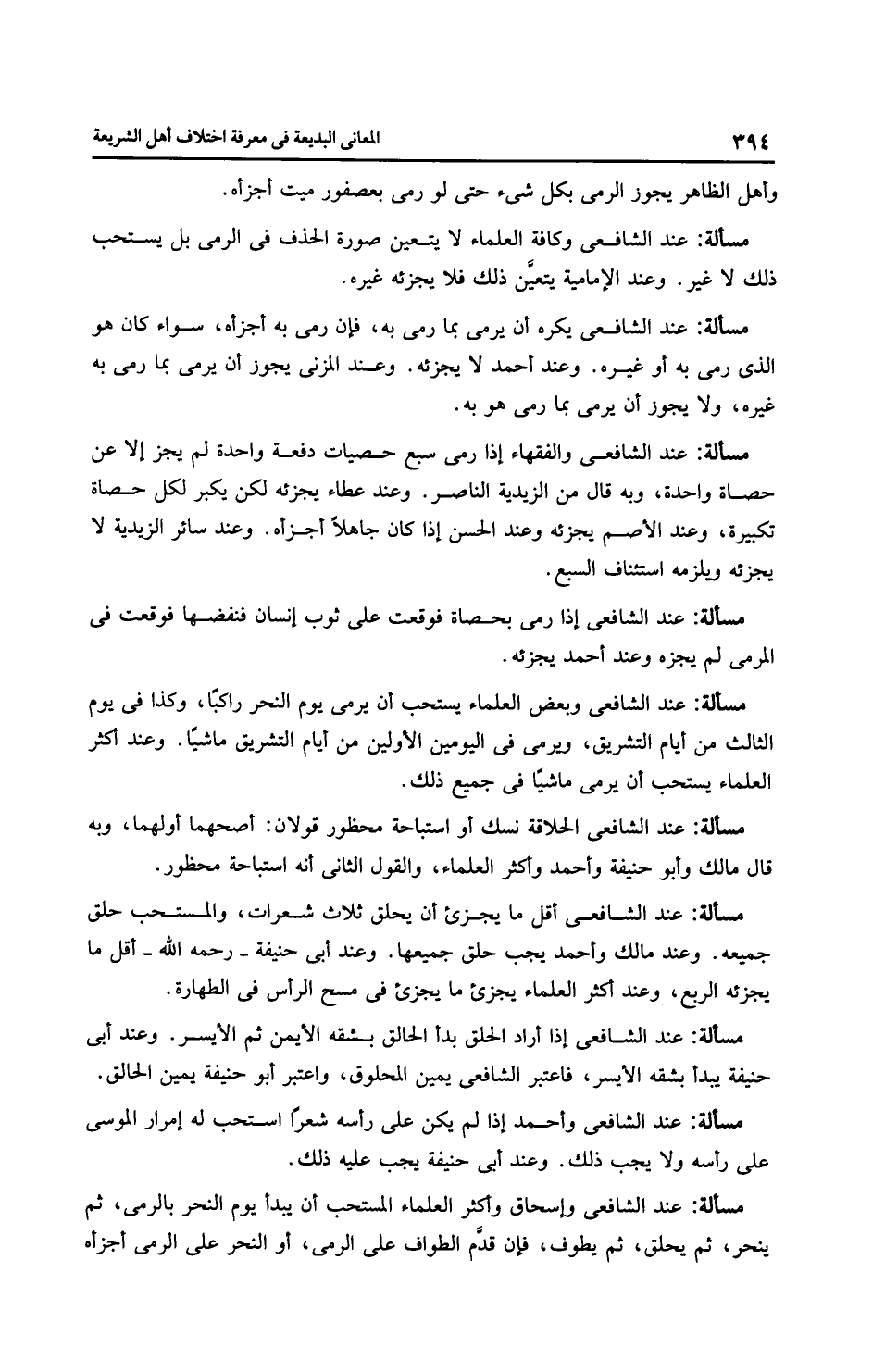 مَسْأَلَةٌ: عِنْدَ الشَّافِعِيِّ وإِسْحَاق وأَكْثَر الْعُلَمَاءِ المستحب أن يبدأ يوم النحر بالرمي، ثم ينحر، ثم يحلق، ثم يطوف، فإن قدم الطواف على الرمي، أو النحر على الرمي أجزأه