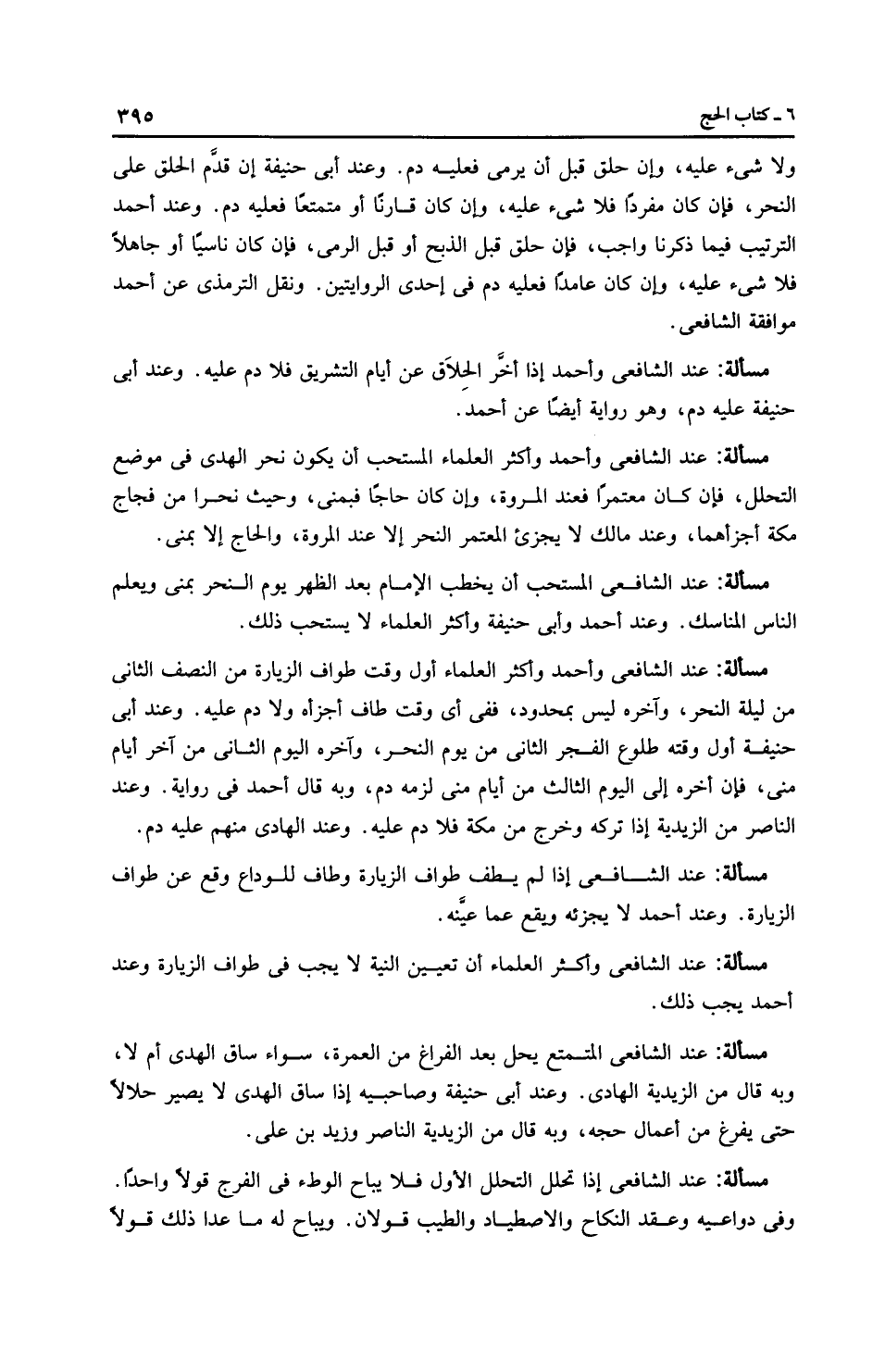 ولا شيء عليه، وإن حلق قبل أن يرمي فعليه دم. وعند أَبِي حَنِيفَةَ إن قدَّم الحلق على النحر، فإن كان مفردًا فلا شيء عليه، وإن كان قارنًا أو متمتعًا فعليه دم. وعند أحمد الترتيب فيما ذكرنا واجب، فإن حلق قبل الذبح أو قبل الرمي، فإن كان ناسيًا أو جاهلاً فلا شيء عليه، وإن كان عامدًا فعليه دم في إحدى الروايتين. ونقل الترمذي عن أحمد موافقة الشَّافِعِيّ.