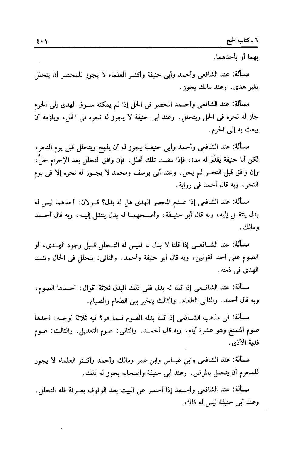 مَسْأَلَةٌ: عِنْدَ الشَّافِعِيِّ وَأَحْمَدَ وأَبِي حَنِيفَةَ وأَكْثَر الْعُلَمَاءِ لا يجوز للمحصر أن يتحلل بغير هدْي. وعند مالك يجوز.