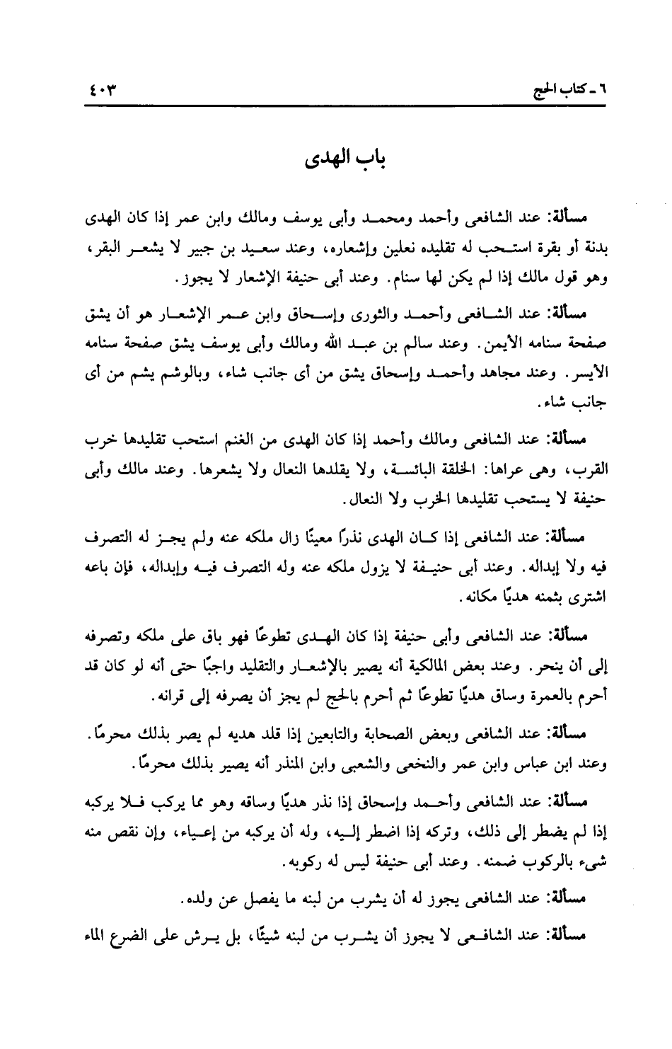 مَسْأَلَةٌ: عِنْدَ الشَّافِعِيِّ وبعض الصحابة والتابعين إذا قلد هدْيه لم يصر بذلك محرمًا. وعند ابن عَبَّاسٍ وابن عمر والنَّخَعِيّ والشعبي وابن المنذر أنه يصير بذلك محرمًا.