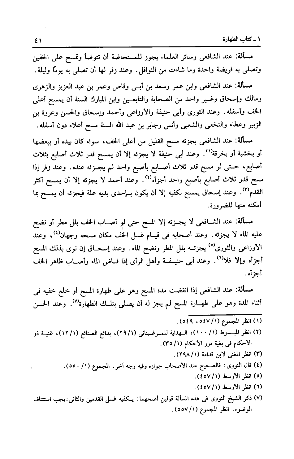 مَسْأَلَةٌ: عِنْدَ الشَّافِعِيِّ وابن عمر وسعد بن أبي وقاص وعمر بن عبد العزيز والزُّهْرِيّ وَمَالِك وإِسْحَاق وغير واحد من الصحابة والتابعين وابن الْمُبَارَك السنة أن يمسح أعلى الخف وأسفله. وعند الثَّوْرِيّ وأَبِي حَنِيفَةَ والْأَوْزَاعِيّ وَأَحْمَد وإِسْحَاق والحسن وعروة بن الزبير وعَطَاء والنَّخَعِيّ والشعبي وأنس وجابر بن عبد الله السنة مسح أعلاه دون أسفله.