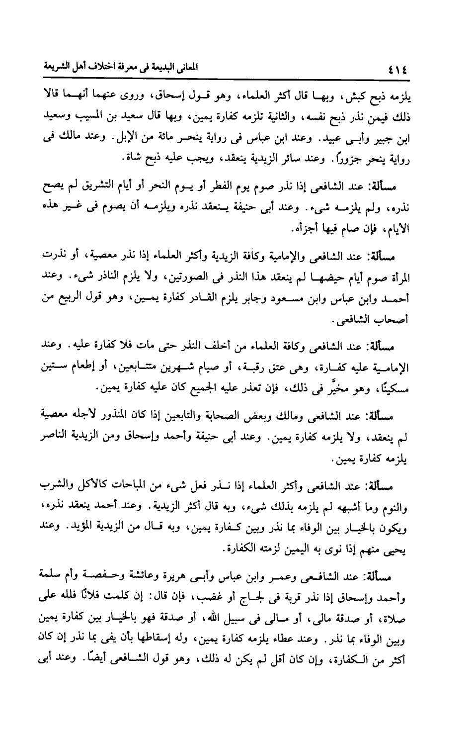 مَسْأَلَةٌ: عِنْدَ الشَّافِعِيِّ وكافة العلماء من أخلف النذر حتى مات فلا كفارة عليه. وعند الْإِمَامِيَّة عليه كفارة، وهي عتق رقبة، أو صيام شهرين متتابعين، أو إطعام ستين مسكينًا، وهو مخيَّر في ذلك، فإن تعذر عليه الجميع كان عليه كفارة يمين.