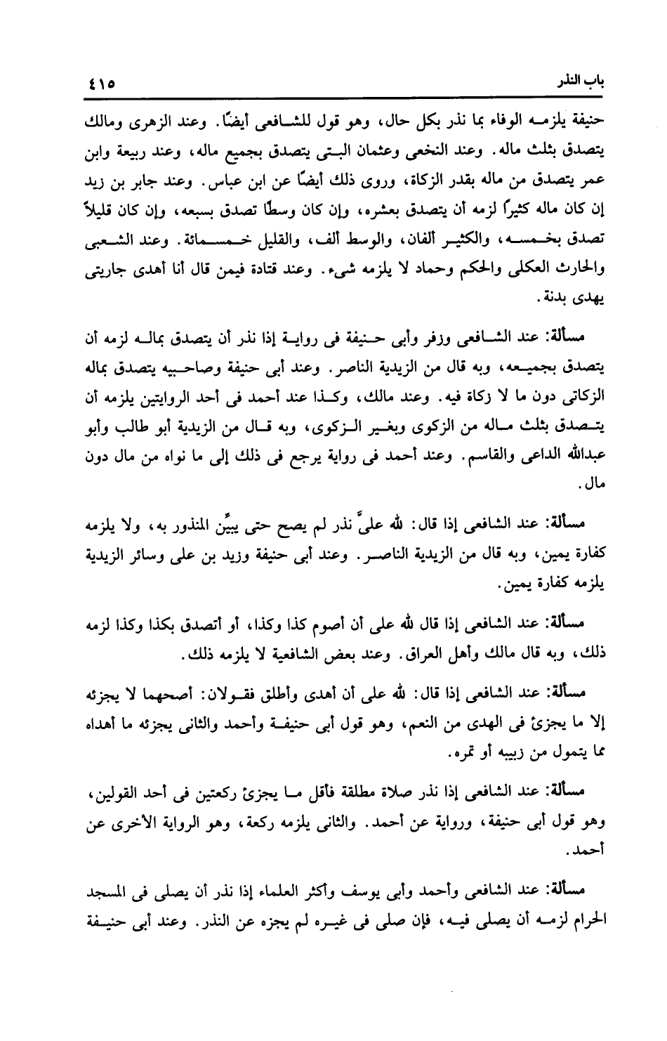 مَسْأَلَةٌ: عِنْدَ الشَّافِعِيِّ إذا قال: للَّهِ عليَّ نذر لم يصح حتى يبيِّن المنذور به، ولا يلزمه كفارة يمين، وبه قال من الزَّيْدِيَّة النَّاصِر. وعند أَبِي حَنِيفَةَ وزيد بن علي وسائر الزَّيْدِيَّة يلزمه كفارة يمين.