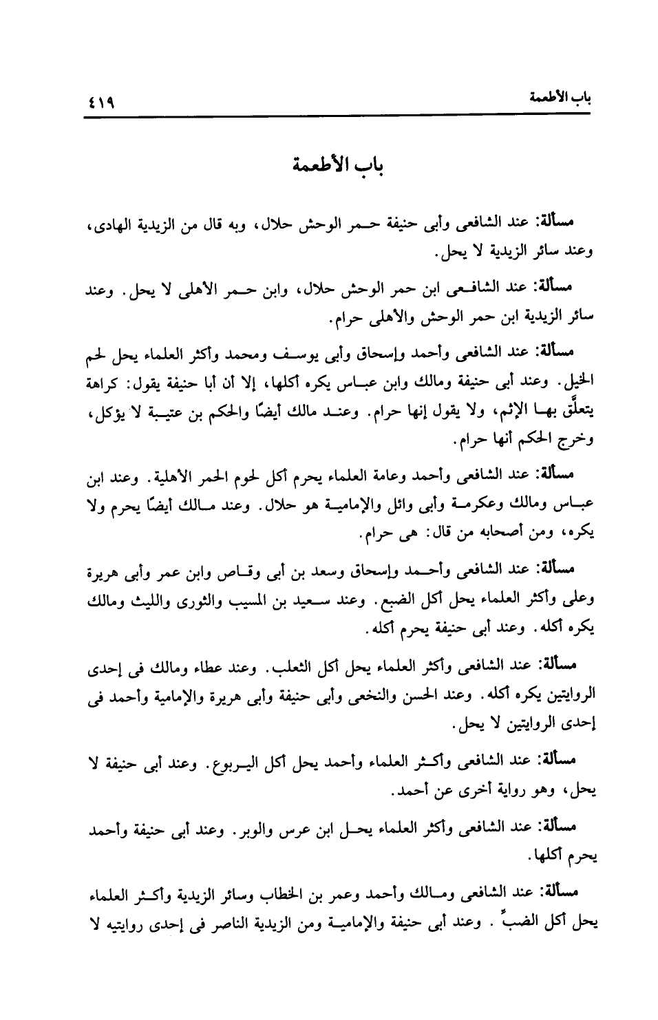 مَسْأَلَةٌ: عِنْدَ الشَّافِعِيِّ وَأَحْمَدَ وإِسْحَاق وأَبِي يُوسُفَ ومُحَمَّد وأَكْثَر الْعُلَمَاءِ يحل لحم الخيل. وعند أَبِي حَنِيفَةَ وَمَالِك وابن عَبَّاسٍ يكره أكلها، إلا أن أبا حَنِيفَةَ يقول: كراهة يتعلق بها الإثم، ولا يقول إنها حرام. وعند مالك أيضًا والحكم بن عتيبة لا يؤكل، وخرج الحكم أنها حرام.