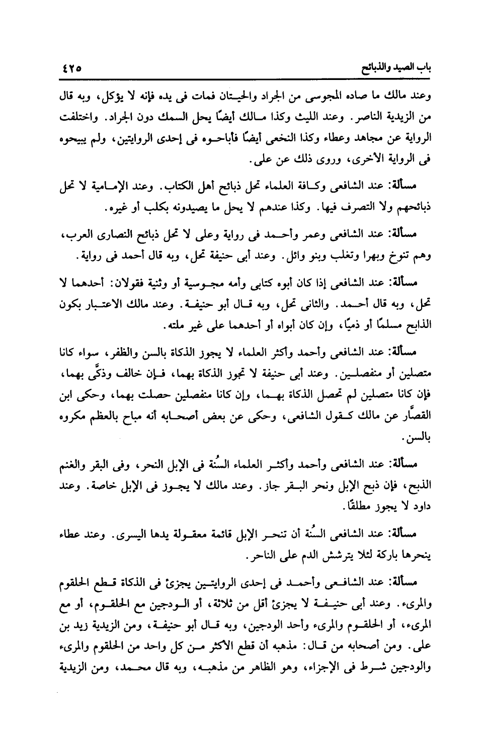 مَسْأَلَةٌ: عِنْدَ الشَّافِعِيِّ وَأَحْمَدَ في إحدى الروايتين يجزئ في الذكاة قطع الحلقوم والمريء. وعند أَبِي حَنِيفَةَ لا يجزئ أقل من ثلاثة، أو الودجين مع الحلقوم، أو مع المريء، أو الحلقوم والمريء وأحد الودجين، وبه قال أبو حَنِيفَةَ، ومن الزَّيْدِيَّة زيد بن على. ومن أصحابه من قال: مذهبه أن قطع الأكثر من كل واحد من الحلقوم والمريء والودجين شرط في الإجزاء، وهو الظاهر من مذهبه، وبه قال محمد، ومن الزَّيْدِيَّة