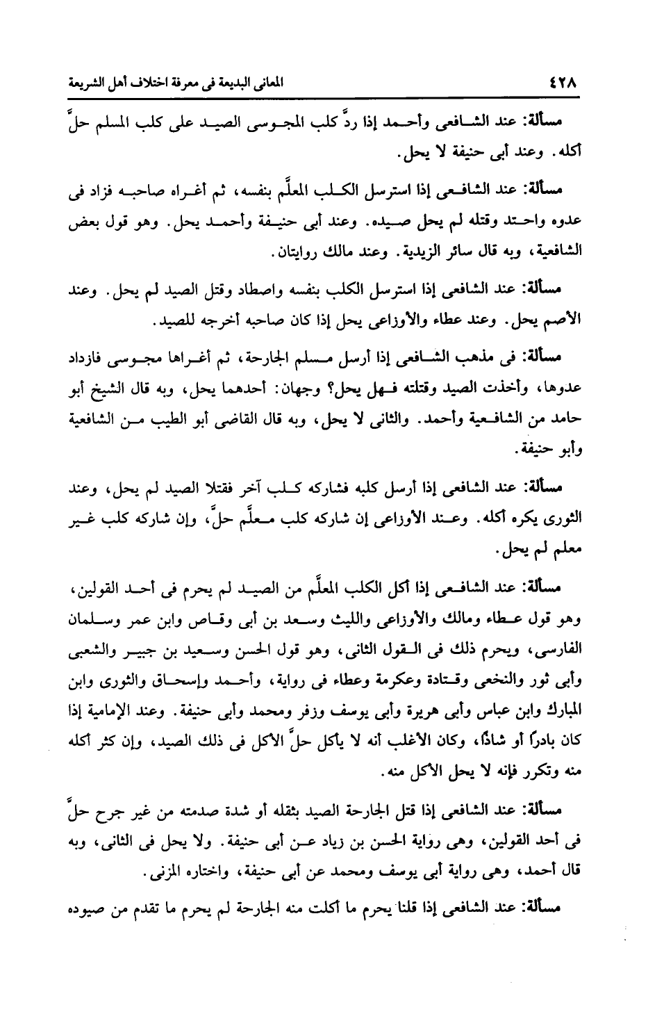 مَسْأَلَةٌ: عِنْدَ الشَّافِعِيِّ وَأَحْمَدَ إذا ردَّ كلب المجوسي الصيد على كلب المسلم حلَّ أكله. وعند أَبِي حَنِيفَةَ لا يحل.