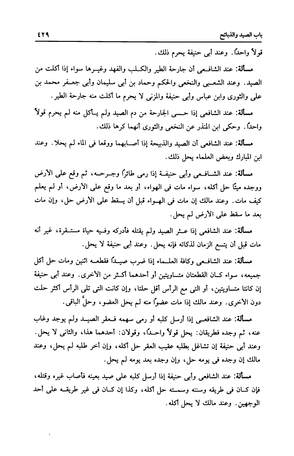 مَسْأَلَةٌ: عِنْدَ الشَّافِعِيِّ وكافة العلماء إذا ضرب صيدًا فقطعه اثنين ومات حل أكل جميعه، سواء كان القطعتان متساويتين أو أحدهما أكثر من الأخرى. وعند أَبِي حَنِيفَةَ إن كانتا متساويتين، أو التي مع الرأس أقل حلتا، وإن كانت التي تلي الرأس أكثر حلت دون الأخرى. وعند مالك إذا مات عضوًا منه لم يحل العضو، وحلَّ الباقي.