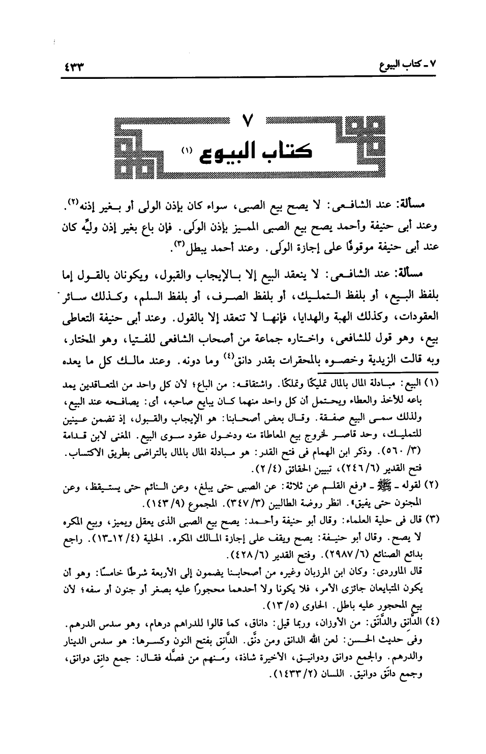 مَسْأَلَةٌ: عِنْدَ الشَّافِعِيِّ: لا يصح بيع الصبي، سواء كان بإذن الولي أو بغير إذنه. وعند أَبِي حَنِيفَةَ وَأَحْمَد يصح بيع الصبي المميز بإذن الوَلي. فإن باع بغير إذن وليِّه كان عند أَبِي حَنِيفَةَ موقوفًا على إجازة الوَلي. وعند أَحْمَد يبطل.