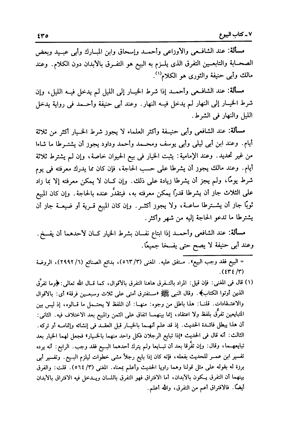 مَسْأَلَةٌ: عِنْدَ الشَّافِعِيِّ والْأَوْزَاعِيّ وَأَحْمَد وإِسْحَاق وابن الْمُبَارَك وأبي عبيد وبعض الصحابة والتابعين التفرق الذي يلزم به البيع هو التفرق بالأبدان دون الكلام. وعند مالك وأَبِي حَنِيفَةَ والثَّوْرِيّ هو الكلام.