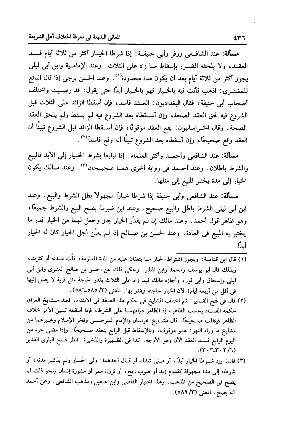 مَسْأَلَةٌ: عِنْدَ الشَّافِعِيِّ وزفر وأَبِي حَنِيفَةَ: إذا شرطا الخيار أكثر من ثلاثة أيام فسد العقد، ولا يلحقه الضرر بإسقاط ما زاد على الثلاث. وعند الْإِمَامِيَّة وابن أبي ليلى يجوز أكثر من ثلاثة أيام بعد أن يكون مدة محدودة. وعند الحسن يرجى إذا قال البائع للمشتري: اذهب فأنت فيه بالخيار فهو بالخيار أبدًا حتى يقول: قد رضيت واختلف أصحاب أَبِي حَنِيفَةَ، فقال البغداديون: العقد فاسد، فإن أسقطا الزائد على الثلاث قبل الشروع فيه لحق العقد الصحة، وإن أسقطاه بعد الشروع فيه لم يسقط ولم يلحق العقد الصحة. وقال الخراسانيون: يقع العقد موقوفًا، فإن أسقطا الزائد قبل الشروع تبينَّا أن العقد وقع صحيحًا، وإن أسقطاه بعد الشروع تبينَّا أنه وقع فاسدًا.