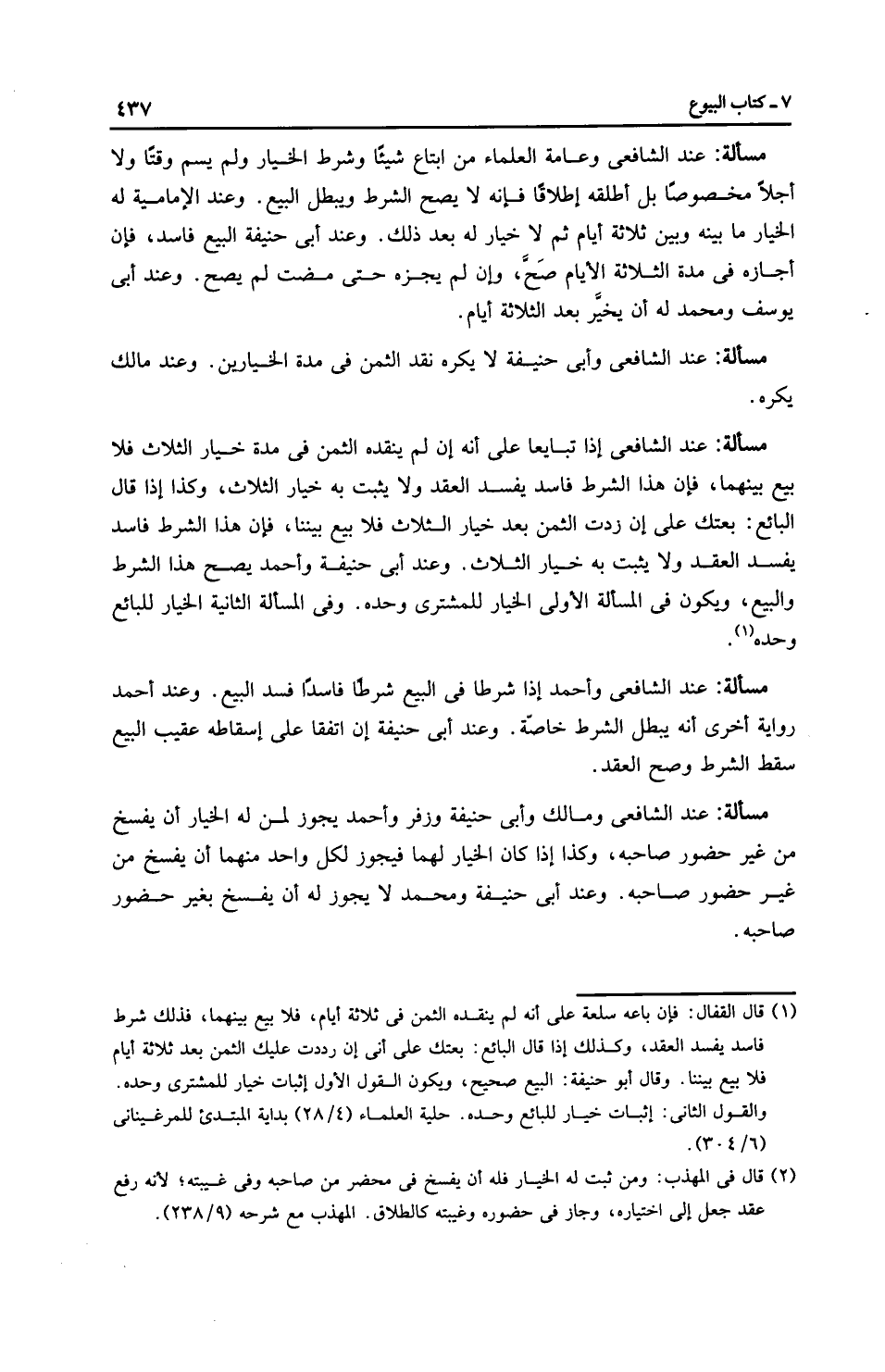 مَسْأَلَةٌ: عِنْدَ الشَّافِعِيِّ وعامة العلماء من ابتاع شيئًا وشرط الخيار ولم يسم وقتًا ولا أجلاً مخصوصًا بل أطلقه إطلاقًا فإنه لا يصح الشرط ويبطل البيع. وعند الْإِمَامِيَّة له الخيار ما بينه وبين ثلاثة أيام ثم لا خيار له بعد ذلك. وعند أَبِي حَنِيفَةَ البيع فاسد، فإن أجازه في مدة الثلاثة الأيام صَحَّ، وإن لم يجزه حتى مضت لم يصح. وعند أبي يوسف ومُحَمَّد له أن يخير بعد الثلاثة أيام.