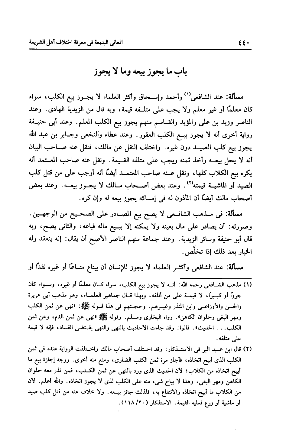 مَسْأَلَةٌ: عِنْدَ الشَّافِعِيِّ وَأَحْمَدَ وإِسْحَاق وأَكْثَر الْعُلَمَاءِ لا يجوز بيع الكلب، سواء كان معلمًا أو غير معلم ولا يجب على متلفه قيمة، وبه قال من الزَّيْدِيَّة الهادي. وعند النَّاصِر وزيد بن علي والمؤيد والقاسم منهم يجوز بيع الكلب المعلم. وعند أَبِي حَنِيفَةَ رِوَايَة أخرى أنه لا يجوز بيع الكلب العقور. وعند عَطَاء والنَّخَعِيّ وجابر بن عبد الله يجوز بيع كلب الصيد دون غيره. واختلف النقل عن مالك، فنقل عنه صاحب البيان أنه لا يحل بيعه وأخذ ثمنه ويجب على متلفه القيمة. ونقل عنه صاحب المعتمد أنه يكره بيع الكلاب كلها، ونقل عنه صاحب المعتمد أيضًا أنه أوجب على من قتل كلب الصيد أو الماشية قيمته. وعند بعض أصحاب مالك لا يجوز بيعه. وعند بعض أصحاب مالك أيضًا أن المأذون له في إمساكه يجوز بيعه له وإن كره.