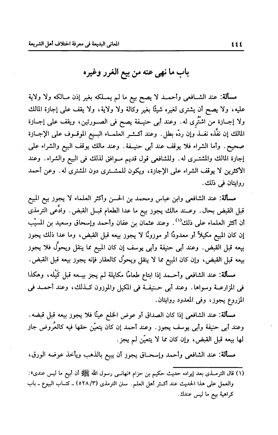 مَسْأَلَةٌ: عِنْدَ الشَّافِعِيِّ وابن عَبَّاسٍ ومُحَمَّد بن الحسن وأَكْثَر الْعُلَمَاءِ لا يجوز بيع المبيع قبل القبض بحال. وعند مالك يجوز بيع ما عدا الطعام قبل القبض. وادعى الترمذي أن أَكْثَر الْعُلَمَاءِ على ذلك. وعند عثمان بن عفان وَأَحْمَد وإِسْحَاق وسعيد بن المسيب إن كان المبيع مكيلاً أو معدودًا أو موزونًا لا يجوز بيعه قبل القبض، وما عدا ذلك يجوز بيعه قبل القبض. وعند أَبِي حَنِيفَةَ وأَبِي يُوسُفَ إن كان المبيع مما ينقل ويحول فلا يجوز بيعه قبل القبض، وإن كان المبيع مما لا ينقل ويحوّل كالعقار فإنه يجوز بيعه قبل القبض.