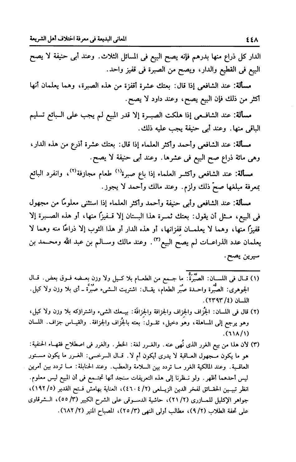 الدار كل ذراع منها بدرهم فإنه يصح البيع في المسائل الثلاث. وعند أَبِي حَنِيفَةَ لا يصح البيع في القطيع والدار، ويصح من الصبرة في قفيز واحد.