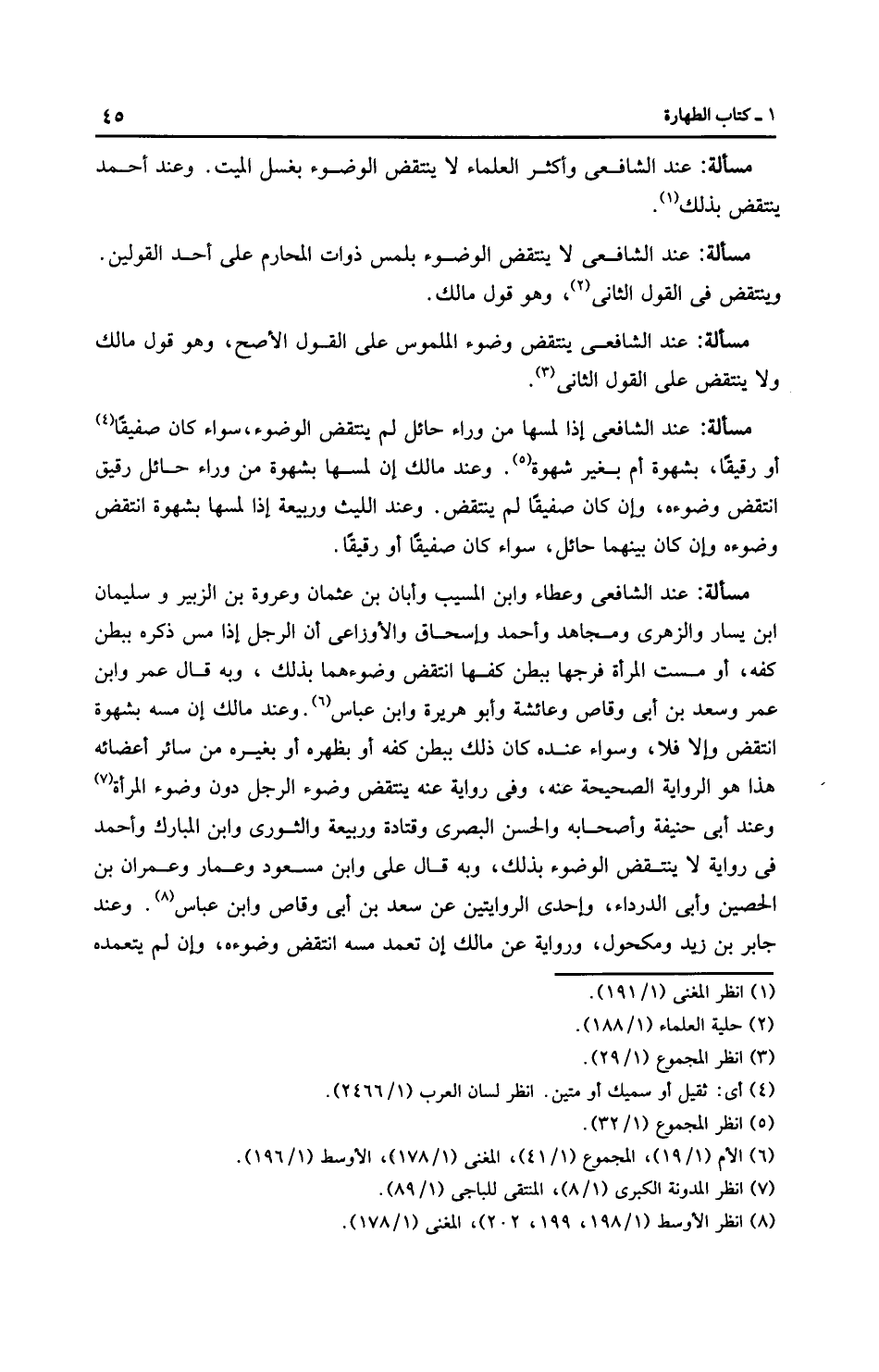 مَسْأَلَةٌ: عِنْدَ الشَّافِعِيِّ وعَطَاء وابن المسيب وأبان بن عثمان وعروة بن الزبير وسليمان ابن يسار والزُّهْرِيّ ومجاهد وَأَحْمَد وإِسْحَاق والْأَوْزَاعِيّ أن الرجل إذا مس ذكره ببطن كفه، أو مست المرأة فرجها ببطن كفها انتقض وضوءهما بذلك، وبه قال عمر وابن عمر وسعد بن أبي وقاص وعائشة وأبو هريرة وابن عباس. وعند مالك إن مسه بشهوة انتقض وإلا فلا، وسواء عنده كان ذلك ببطن كفه أو بظهره أو بغيره من سائر أعضائه هذا هو الرِوَايَة الصحيحة عنه، وفي رِوَايَة عنه ينتقض وضوء الرجل دون وضوء المرأة وعند أَبِي حَنِيفَةَ وأصحابه والحسن البصري وقتادة ورَبِيعَة والثَّوْرِيّ وابن الْمُبَارَك وَأَحْمَد فى رِوَايَة لا ينتقض الوضوء بذلك، وبه قال علي وابن مسعود وعمار وعمران بن الحصين وأبي الدرداء، وإحدى الروايتين عن سعد بن أبي وقاص وابن عباس. وعند جابر بن زيد ومَكْحُول، ورِوَايَة عن مالك إن تعمد مسه انتقض وضوءه، وإن لم يتعمده