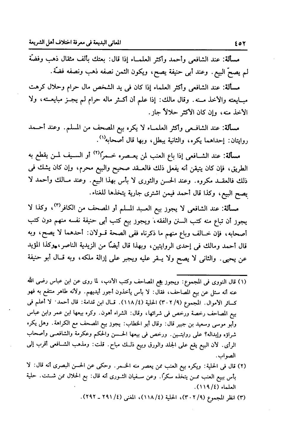 مَسْأَلَةٌ: عِنْدَ الشَّافِعِيِّ وأَكْثَر الْعُلَمَاءِ لا يكره بيع المصحف من المسلم. وعند أحمد رِوَايَتَانِ: إحداهما يكره، والثانية يبطل، وبها قال أصحابه.