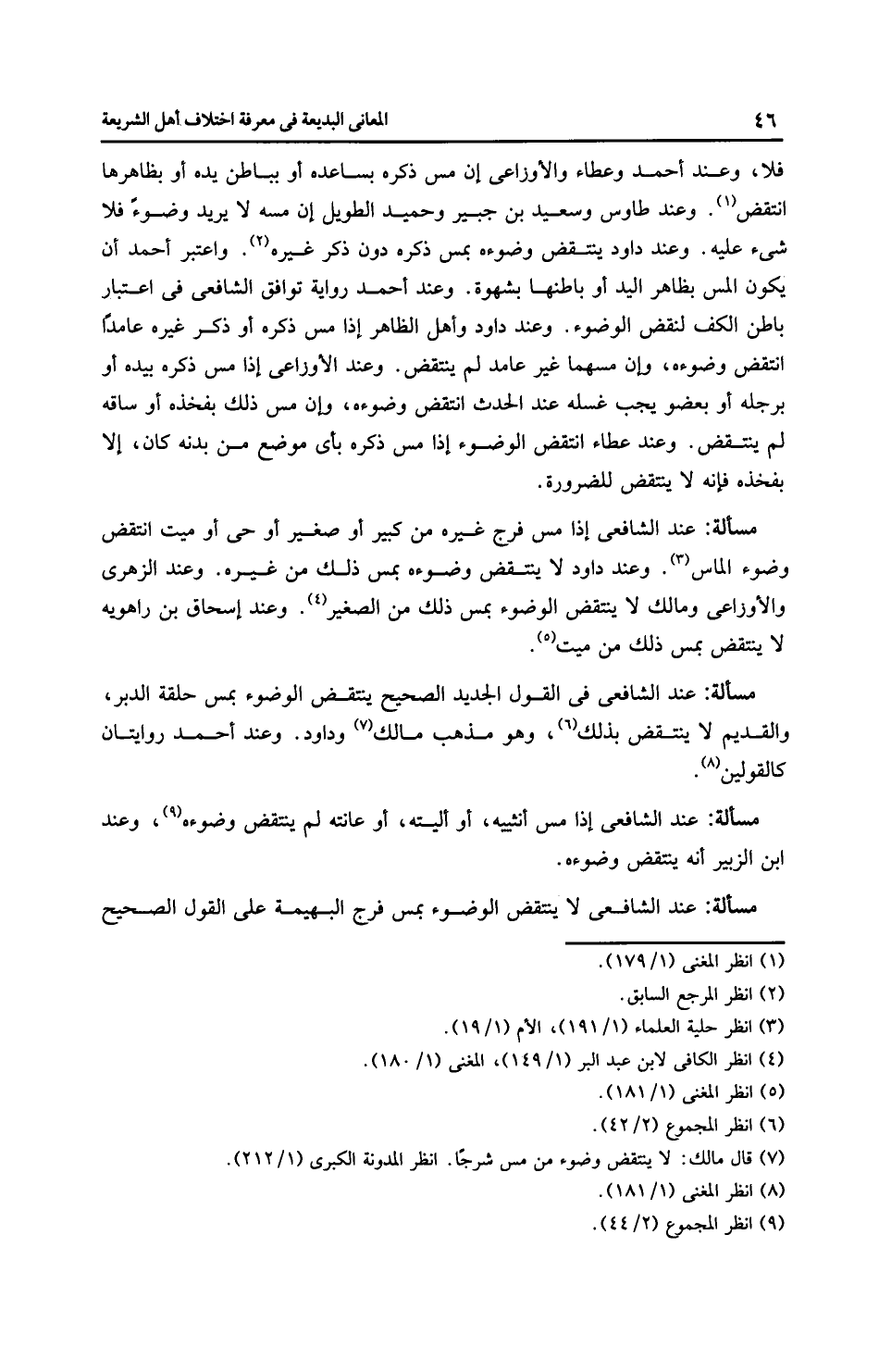 مَسْأَلَةٌ: عِنْدَ الشَّافِعِيِّ في القول الجديد الصحيح ينتقض الوضوء بمس حلقة الدبر، والقديم لا ينتقض بذلك، وهو مذهب مالك وداود. وعند أَحْمَد رِوَايَتَانِ كالقولين.