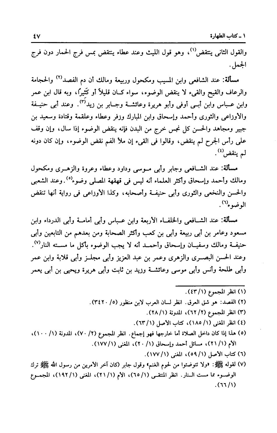 مَسْأَلَةٌ: عِنْدَ الشَّافِعِيِّ وابن المسيب ومَكْحُول ورَبِيعَة وَمَالِك أن دم الفصد والحجامة والرعاف والقيح والقيء لا ينقض الوضوء، سواء كان قليلاً أو كَثيرًا، وبه قال ابن عمر وابن عَبَّاسٍ وابن أبي أوفى وأبو هريرة وعائشة وجابر بن زيد. وعند أَبِي حَنِيفَةَ والْأَوْزَاعِيّ والثَّوْرِيّ وَأَحْمَد وإِسْحَاق وابن الْمُبَارَك وزفر وعَطَاء وعلقمة وقتادة وسعيد بن جبير ومجاهد والحسن كل نجس خرج من البدن فإنه ينقض الوضوء إذا سال، وإن وقف على رأس الجرح لم ينقض، وقالوا في القيء إن ملأ الفم نقض الوضوء، وإن كان دونه لم ينقض.