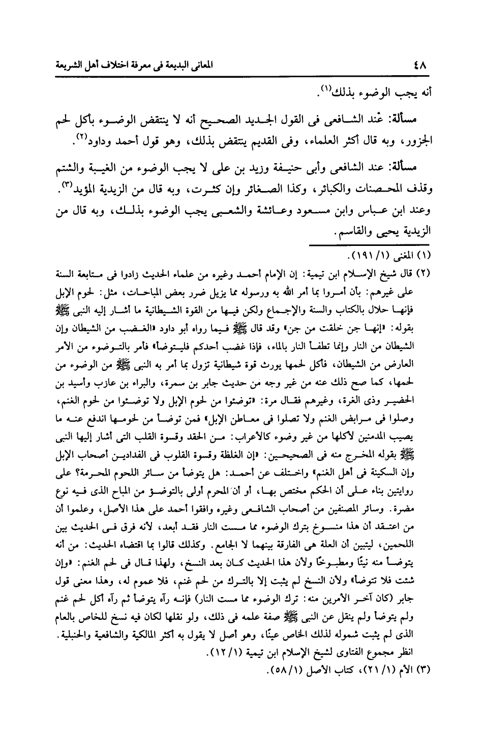 مَسْأَلَةٌ: عِنْدَ الشَّافِعِيِّ في القول الجديد الصحيح أنه لا ينتقض الوضوء بأكل لحم الجزور، وبه قال أَكْثَر الْعُلَمَاءِ، وفي القديم ينتقض بذلك، وهو قول أَحْمَد وداود.