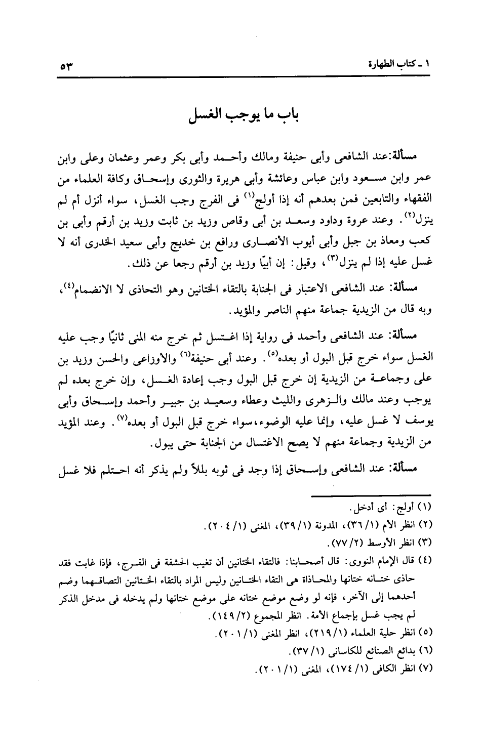 مَسْأَلَةٌ: عِنْدَ الشَّافِعِيِّ وأَبِي حَنِيفَةَ وَمَالِك وَأَحْمَد وأبي بكر وعمر وعثمان وعلي وابن عمر وابن مسعود وابن عَبَّاسٍ وعائشة وأبي هريرة والثَّوْرِيّ وإِسْحَاق وكافة العلماء من الفقهاء والتابعين فمن بعدهم أنه إذا أولج في الفرج وجب الغسل، سواء أنزل أم لم ينزل. وعند عروة وداود وسعد بن أبي وقاص وزيد بن ثابت وزيد بن أرقم وأبي بن كعب ومعاذ بن جبل وأبي أيوب الأنصاري ورافع بن خديج وأبي سعيد الخدري أنه لا غسل عليه إذا لم ينزل، وقيل: إن أبيًّا وزيد بن أرقم رجعا عن ذلك.