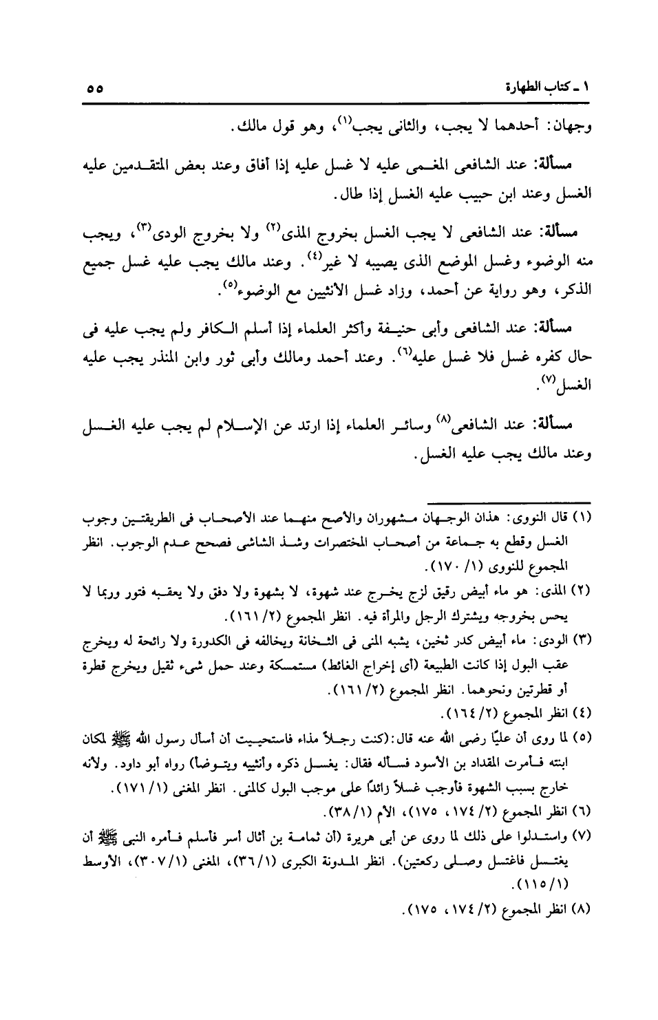 مَسْأَلَةٌ: عِنْدَ الشَّافِعِيِّ لا يجب الغسل بخروج المذي ولا بخروج الودي، ويجب منه الوضوء وغسل الموضع الذي يصيبه لا غير. وعند مالك يجب عليه غسل جميع الذكر، وهو رِوَايَة عن أحمد، وزاد غسل الأنثيين مع الوضوء.