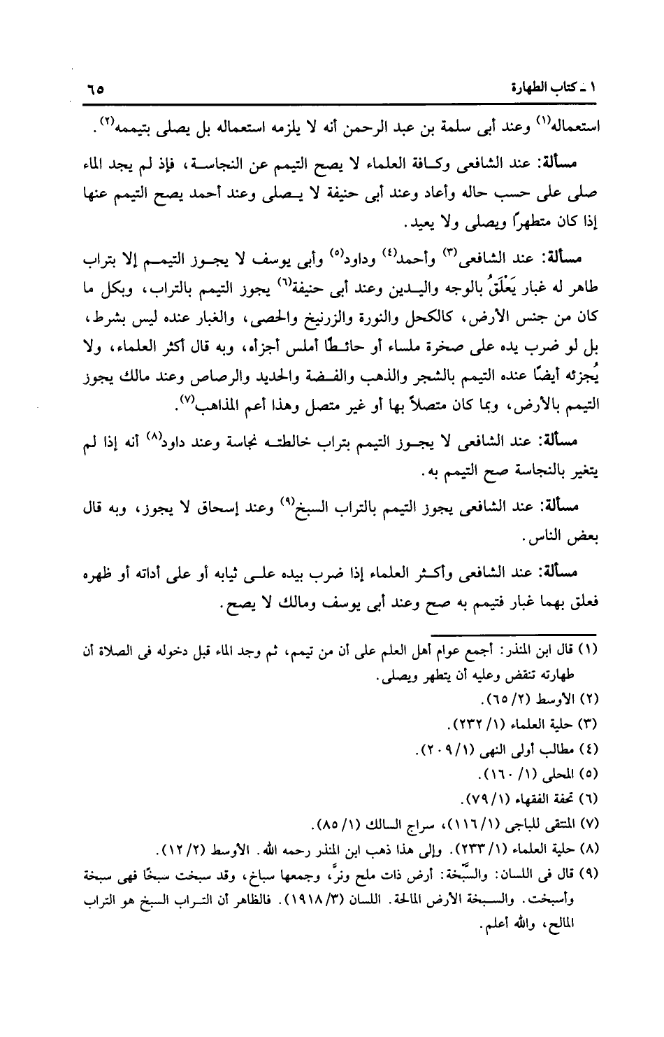 مَسْأَلَةٌ: عِنْدَ الشَّافِعِيِّ وَأَحْمَدَ وداود وأَبِي يُوسُفَ لا يجوز التيمم إلا بتراب طاهر له غبار يَعْلَقُ بالوجه واليدين وعند أَبِي حَنِيفَةَ يجوز التيمم بالتراب، وبكل ما كان من جنس الأرض، كالكحل والنورة والزرنيخ والحصى، والغبار عنده ليس بشرط، بل لو ضرب يده على صخرة ملساء أو حائطًا أملس أجزأه، وبه قال أَكْثَر الْعُلَمَاءِ، ولا يُجزئه أيضًا عنده التيمم بالشجر والذهب والفضة والحديد والرصاص وعند مالك يجوز التيمم بالأرض، وبما كان متصلاً بها أو غير متصل وهذا أعم المذاهب.