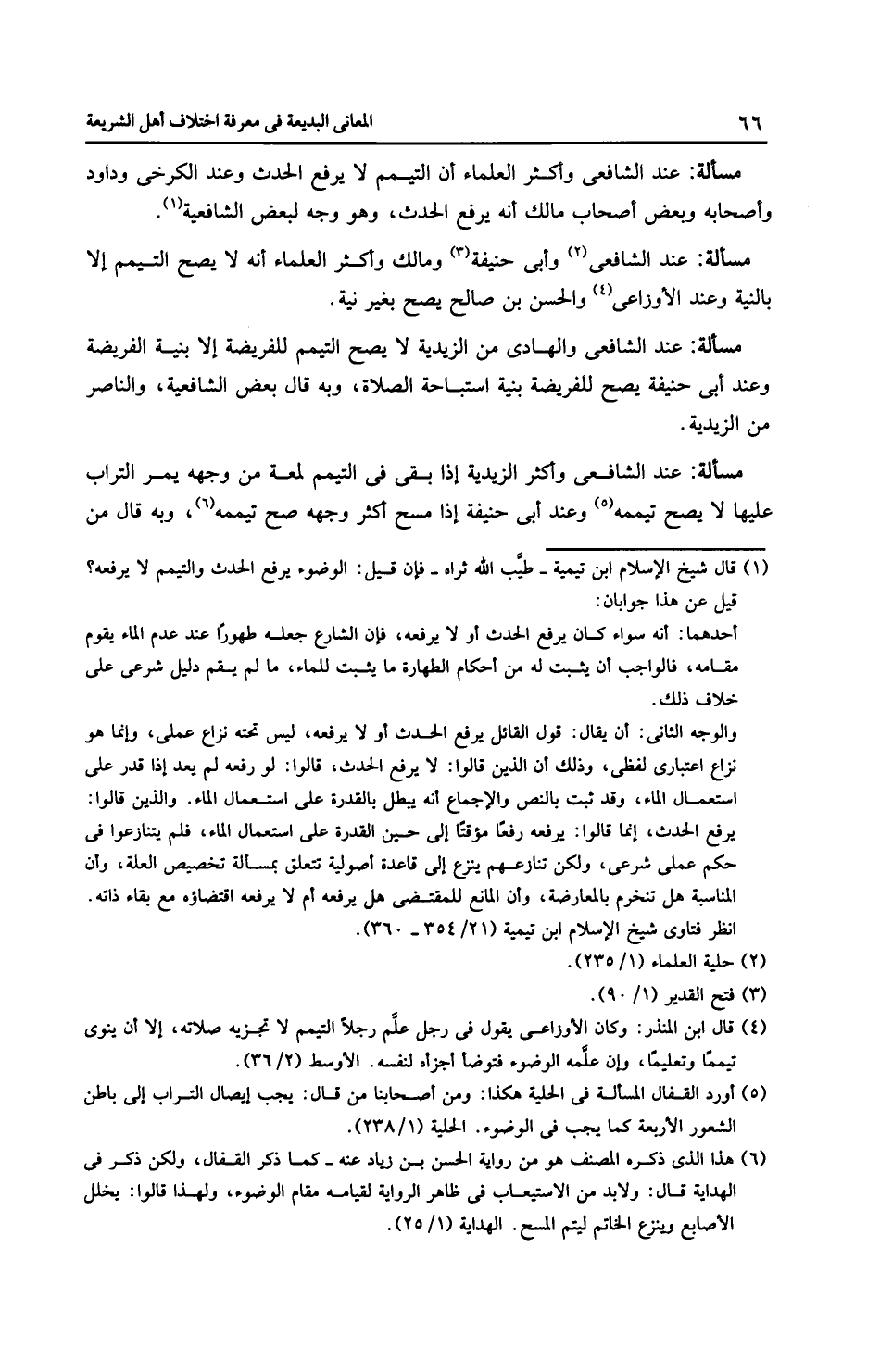مَسْأَلَةٌ: عِنْدَ الشَّافِعِيِّ والهادي من الزَّيْدِيَّة لا يصح التيمم للفريضة إلا بنية الفريضة وعند أَبِي حَنِيفَةَ يصح للفريضة بنية استباحة الصلاة، وبه قال بعض الشَّافِعِيَّة، والنَّاصِر من الزَّيْدِيَّة.