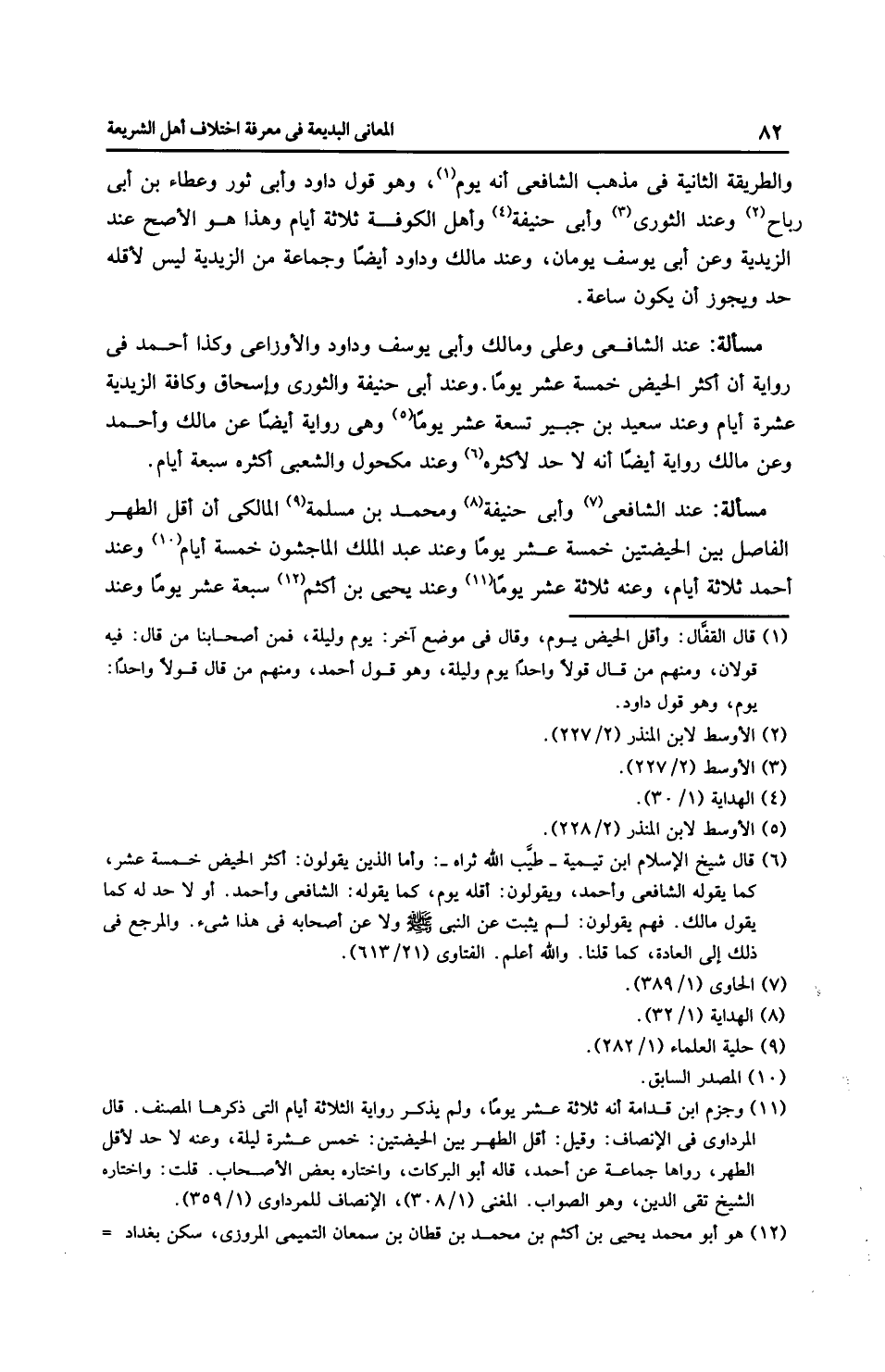 مَسْأَلَةٌ: عِنْدَ الشَّافِعِيِّ وأَبِي حَنِيفَةَ ومُحَمَّد بن مسلمة المالكي أن أقل الطهر الفاصل بين الحيضتين خمسة عشر يومًا وعند عبد الملك الْمَاجِشُون خمسة أيام وعند أَحْمَد ثلاثة أيام، وعنه ثلاثة عشر يومًا وعند يَحْيَى بن أكثم سبعة عشر يومًا وعند