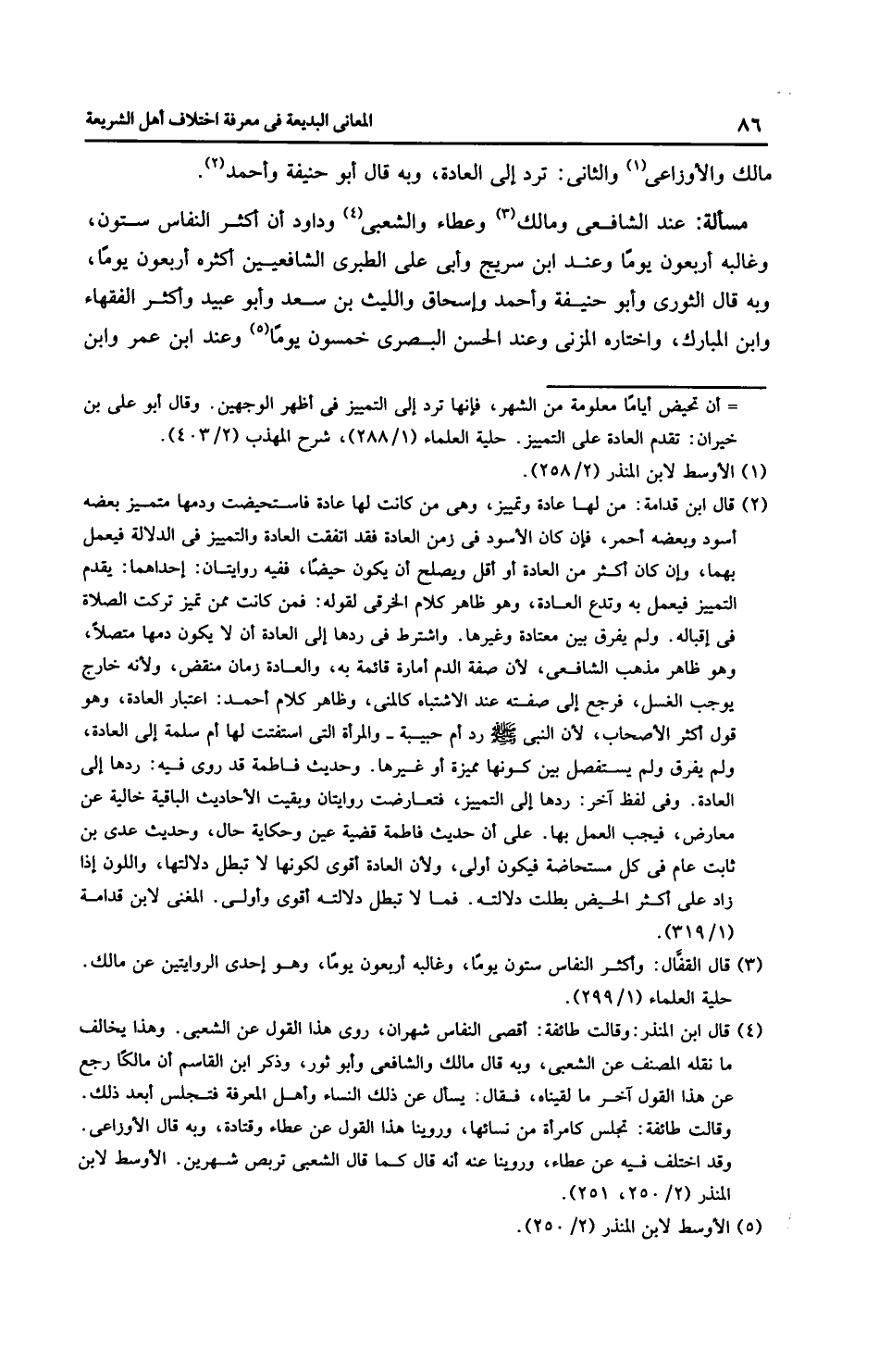 مَسْأَلَةٌ: عِنْدَ الشَّافِعِيِّ وَمَالِك وعَطَاء والشعبي وداود أن أكثر النفاس ستون، وغالبه أربعون يومًا وعند ابن سريج وأبي علي الطبري الشَّافِعِيّين أكثره أربعون يومًا، وبه قال الثَّوْرِيّ وأبو حَنِيفَةَ وَأَحْمَد وإِسْحَاق واللَّيْث بن سعد وأبو عبيد وأكثر الفقهاء وابن الْمُبَارَك، واختاره الْمُزَنِي وعند الحسن البصري خمسون يومًا وعند ابن عمر وابن
