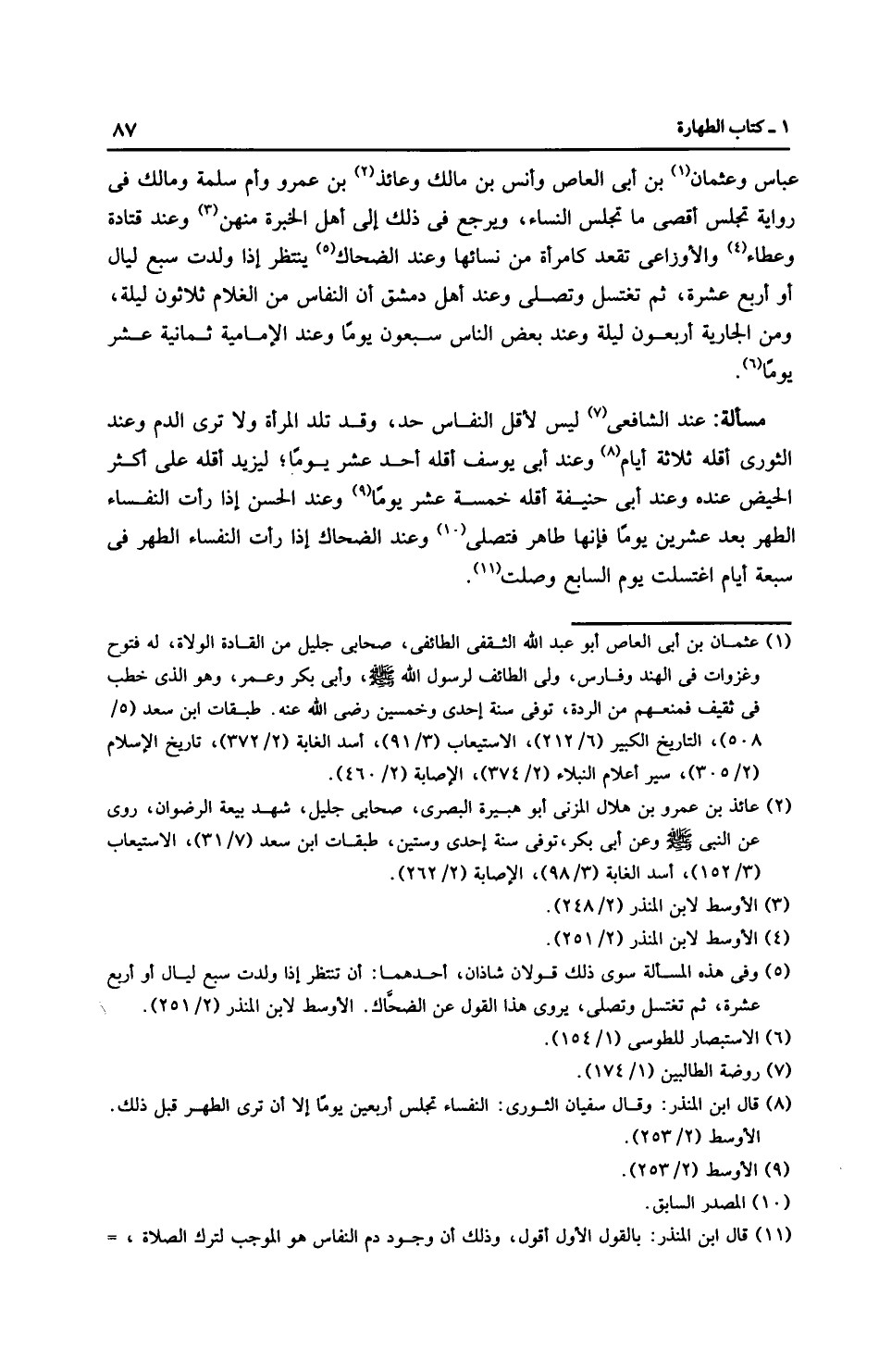 عبَّاس وعثمان بن أبي العاص وأنس بن مالك وعائذ بن عمرو وأم سلمة وَمَالِك في رِوَايَة تجلس أقصى ما تجلس النساء، ويرجع في ذلك إلى أهل الخبرة منهن وعند قتادة وعَطَاء والْأَوْزَاعِيّ تقعد كامرأة من نسائها وعند الضحاك ينتظر إذا ولدت سبع ليال أو أربع عشرة، ثم تغتسل وتصلي وعند أهل دمشق أن النفاس من الغلام ثلاثون ليلة، ومن الجارية أربعون ليلة وعند بعض الناس سبعون يومًا وعند الْإِمَامِيَّة ثمانية عشر يومًا.
