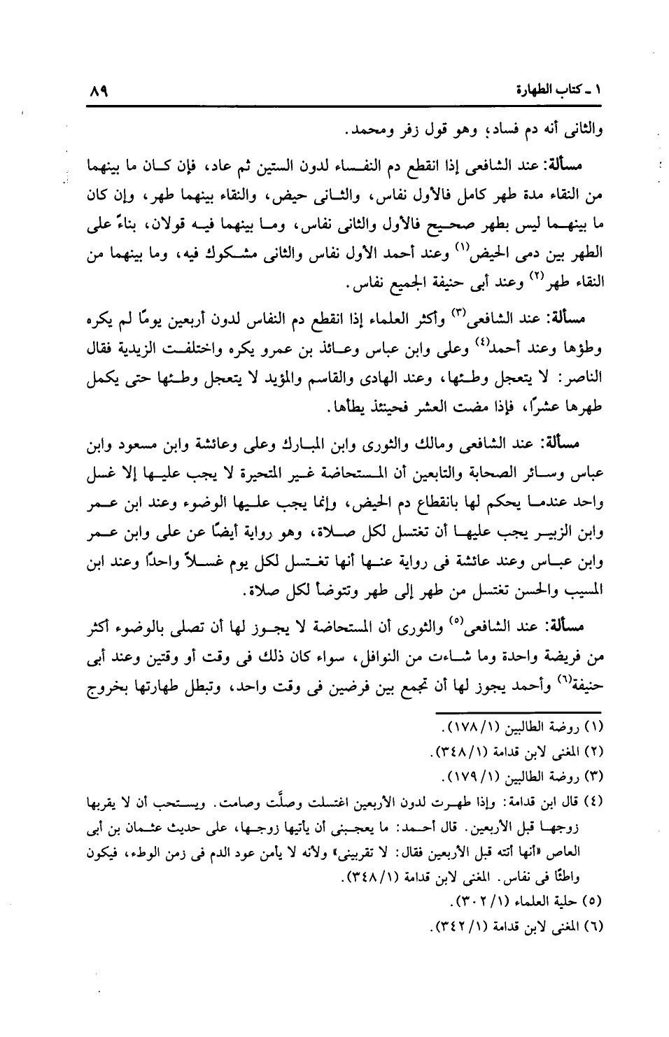 مَسْأَلَةٌ: عِنْدَ الشَّافِعِيِّ إذا انقطع دم النفساء لدون الستين ثم عاد، فإن كان ما بينهما من النقاء مدة طهر كامل فالأول نفاس، والثاني حيض، والنقاء بينهما طهر، وإن كان ما بينهما ليس بطهر صحيح فالأول والثاني نفاس، وما بينهما فيه قَوْلَانِ، بناءً على الطهر بين دمي الحيض وعند أَحْمَد الأول نفاس والثاني مشكوك فيه، وما بينهما من النقاء طهر وعند أَبِي حَنِيفَةَ الجميع نفاس.