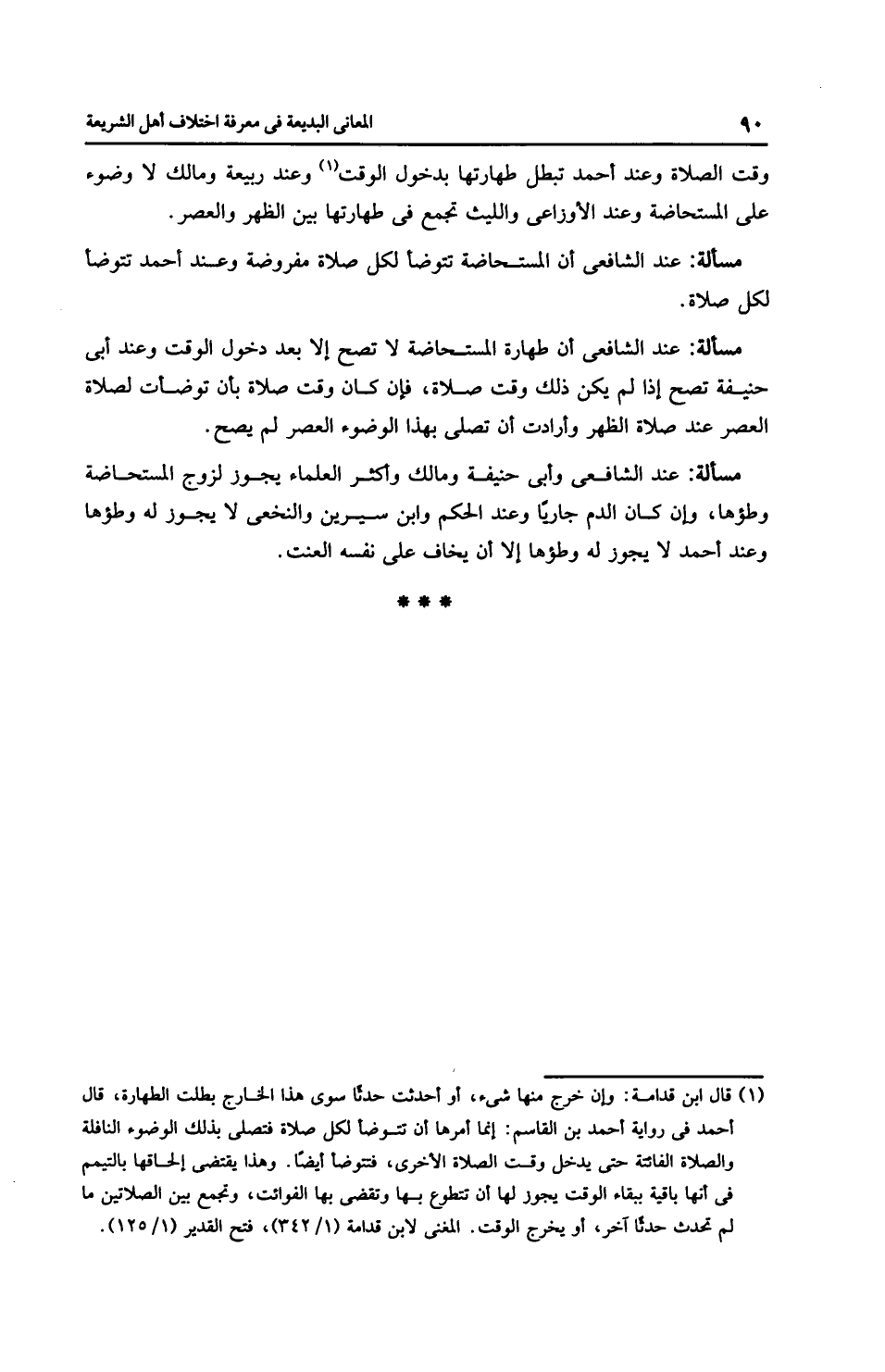 مَسْأَلَةٌ: عِنْدَ الشَّافِعِيِّ أن طهارة المستحاضة لا تصح إلا بعد دخول الوقت وعند أبي حَنِيفَةَ تصح إذا لم يكن ذلك وقت صلاة، فإن كان وقت صلاة بأن توضأت لصلاة العصر عند صلاة الظهر وأرادت أن تصلي بهذا الوضوء العصر لم يصح.