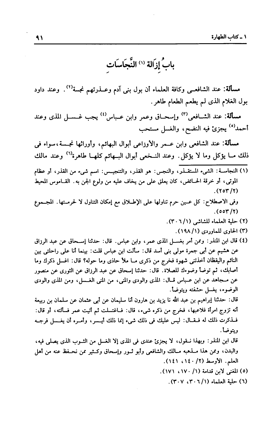 مَسْأَلَةٌ: عِنْدَ الشَّافِعِيِّ وابن عمر والْأَوْزَاعِيّ أبوال البهائم، وأوراثها نجسة، سواء في ذلك ما يؤكل وما لا يؤكل. وعند النَّخَعِيّ أبوال البهائم كلها طاهرة وعند مالك
