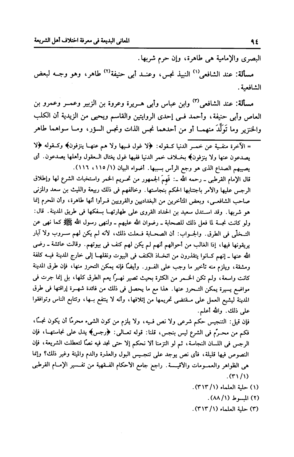 مَسْأَلَةٌ: عِنْدَ الشَّافِعِيِّ النبيذ نجس، وعند أَبِي حَنِيفَةَ طاهر، وهو وجه لبعض الشَّافِعِيَّة.