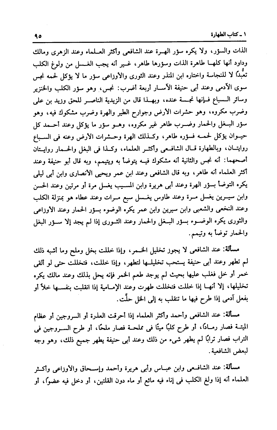 الذات والسؤر، ولا يكره سؤر الهرة عند الشَّافِعِيّ وأَكْثَر الْعُلَمَاءِ وعند الزُّهْرِيّ ومالك وداود أنها كلها طاهرة الذات وسؤرها طاهر، غير أنه يجب الغسل من ولوغ الكلب تعبدًا لا للنجاسة واختاره ابن المنذر وعند الثَّوْرِيّ والْأَوْزَاعِيّ سؤر ما لا يؤكل لحمه نجس سوى الآدمي وعند أَبِي حَنِيفَةَ الآسار أربعة أضرب: نجس، وهو سؤر الكلب والخنزير وسائر السباع فإنها نجسة عنده، وبهذا قال من الزَّيْدِيَّة النَّاصِر للحق وزيد بن علي وضرب مكروه، وهو حشرات الأرض وجوارح الطير والهرة وضرب مشكوك فيه، وهو سؤر البغل والحمار وضرب طاهر غير مكروه، وهو سؤر ما يؤكل وعند أَحْمَد كل حيوان يؤكل لحمه فسؤره طاهر، وكذلك الهرة وحشرات الأرض وعنه في السباع رِوَايَتَانِ، وبالطهارة قال الشَّافِعِيّ وأَكْثَر الْعُلَمَاءِ، وكذا في البغل والحمار رِوَايَتَانِ أصحهما: أنه نجس والثانية أنه مشكوك فيه يتوضأ به ويتيمم، وبه قال أبو حَنِيفَةَ وعند أَكْثَر الْعُلَمَاءِ أنه طاهر، وبه قال الشَّافِعِيّ وعند ابن عمر ويَحْيَى الأنصاري وابن أبي ليلى يكره التوضأ بسؤر الهرة وعند أبي هريرة وابن المسيب يغسل مرة أو مرتين وعند الحسن وابن سِيرِينَ يغسل مرة وعند طاوس يغسل سبع مرات وعند عَطَاء هو بمنزلة الكلب وعند النَّخَعِيّ والشعبي وابن سِيرِينَ وابن عمر يكره الوضوء بسؤر الحمار وعند الْأَوْزَاعِيّ والثَّوْرِيّ يكره الوضوء بسؤر البغل والحمار وعند الثَّوْرِيّ إذا لم يجد إلا سؤر البغل والحمار توضأ به وتيمم.