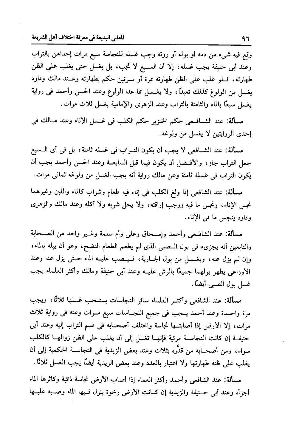 مَسْأَلَةٌ: عِنْدَ الشَّافِعِيِّ وأَكْثَر الْعُلَمَاءِ سائر النجاسات يستحب غسلها ثلاثًا، ويجب مرة واحدة وعند أَحْمَد يجب في جميع النجاسات سبع مرات وعنه في رِوَايَة ثلاث مرات، إلا الأرض إذا أصابتها نجاسة واختلف أصحابه في ضم التراب إليه وعند أبي حَنِيفَةَ إن كانت النجاسة مرئية فإنها تغسل إلى أن يغلب على الظن زوالها كالكلب سواء، ومن أصحابه من قدَّره بثلاث وعند بعض الزَّيْدِيَّة في النجاسة الحكمية إلى أن يغلب على ظنه طهارتها ولا اعتبار بالعدد وعند بعض الزَّيْدِيَّة أيضًا يجب الغسل ثلاثًا.