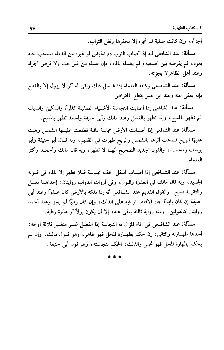 مَسْأَلَةٌ: عِنْدَ الشَّافِعِيِّ إذا أصاب أسفل الخف نجاسة فلا تطهر إلا بالماء في قوله الجديد، وبه قال مالك في العذرة والبول، وفي أرواث الدواب رِوَايَتَانِ: إحداهما تغسل والثانية تمسح. والقول القديم عند الشَّافِعِيّ أنه إذا دلكه بالأرض كان عفوًا وعند أبي حَنِيفَةَ إن كان يابسًا جاز الاقتصار فيه على الدلك، وإن كان رطبًا لم يجز وعند أحمد رِوَايَتَانِ كالقولين. وعنه رِوَايَة ثالثة يعفى عنه، إلا أن يكون بولاً أو عذرة رطبة.
