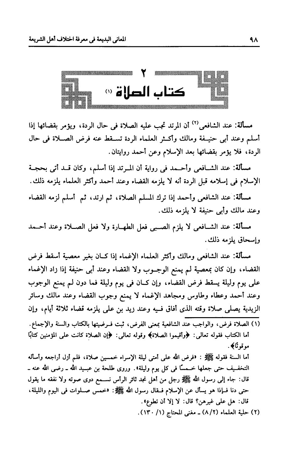 مَسْأَلَةٌ: عِنْدَ الشَّافِعِيِّ أن المرتد تجب عليه الصلاة في حال الردة، ويؤمر بقضائها إذا أسلم وعند أَبِي حَنِيفَةَ وَمَالِك وأَكْثَر الْعُلَمَاءِ الردة تسقط عنه فرض الصلاة في حال الردة، فلا يؤمر بقضائها بعد الْإِسْلَام وعن أَحْمَد رِوَايَتَانِ.