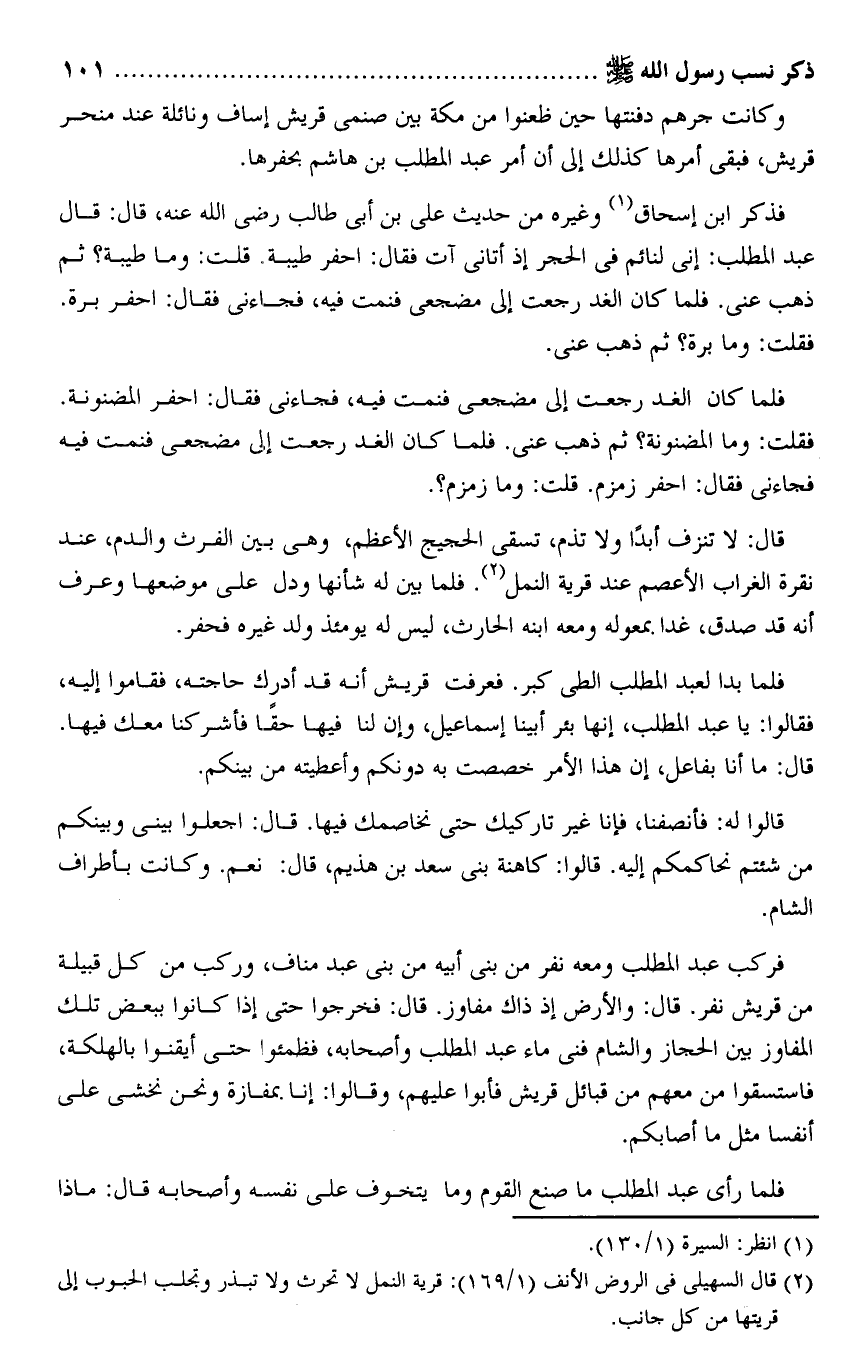 فركب عبد المطلب ومعه نفر من بنى أبيه من بنى عبد مناف، وركب من كل قبيلة من قريش نفر. قال: والأرض إذ ذاك مفاوز. قال: فخرجوا حتى إذا كانوا ببعض تلك المفاوز بين الحجاز والشام فنى ماء عبد المطلب وأصحابه، فظمئوا حتى أيقنوا بالهلكة، فاستسقوا من معهم من قبائل قريش فأبوا عليهم، وقالوا: إنا بمفازة ونحن نخشى على أنفسا مثل ما أصابكم.