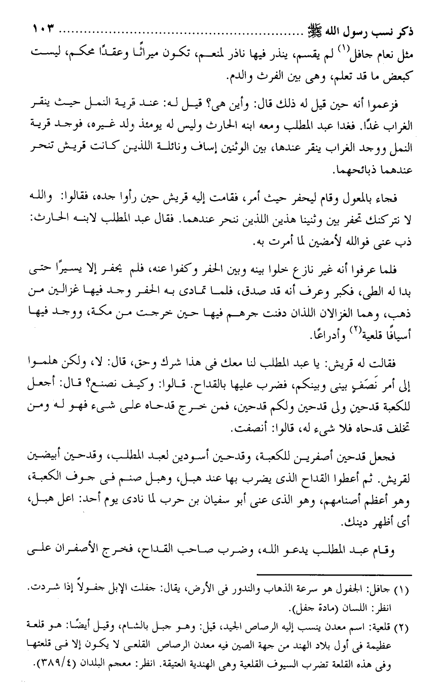 فجاء بالمعول وقام ليحفر حيث أمر، فقامت إليه قريش حين رأوا جده، فقالوا: والله لا نتركنك تحفر بين وثنينا هذين اللذين ننحر عندهما. فقال عبد المطلب لابنه الحارث: