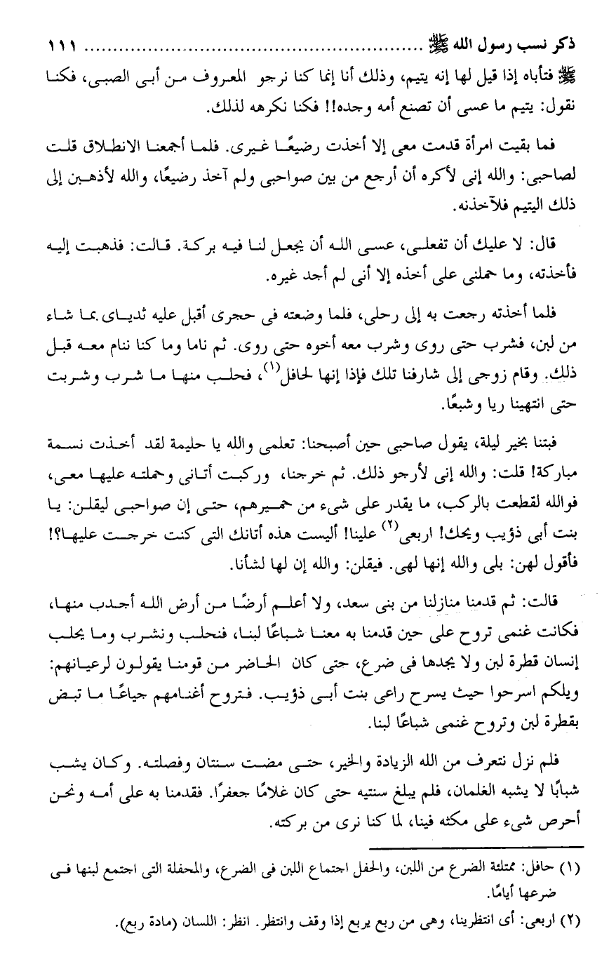 فبتنا بخير ليلة، يقول صاحبى حين أصبحنا: تعلمى والله يا حليمة لقد أخذت نسمة مباركة! قلت: والله إنى لأرجو ذلك. ثم خرجنا، وركبت أتانى وحملته عليها معى، فو الله لقطعت بالركب، ما يقدر على شىء من حميرهم، حتى إن صواحبى ليقلن: يا بنت أبى ذؤيب ويحك! اربعى «2» علينا! أليست هذه أتانك التى كنت خرجت عليها؟! فأقول لهن: بلى والله إنها لهى. فيقلن: والله إن لها لشأنا.