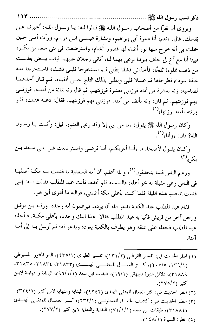 ويروى أن نفرا من أصحاب رسول الله صلى الله عليه وسلم قالوا له: يا رسول الله: أخبرنا عن نفسك. قال: «نعم، أنا دعوة أبى إبراهيم، وبشارة عيسى ابن مريم، ورأت أمى حين حملت بى أنه خرج منها نور أضاء لها قصور الشام، واسترضعت فى بنى سعد بن بكر، فبينا أنا مع أخ لى خلف بيوتنا نرعى بهما لنا، أتانى رجلان عليهما ثياب بيض بطست من ذهب مملوءة ثلجا، فأخذانى فشقا بطنى ثم استخرجا قلبى فشقاه فاستخرجا منه علقة سوداء فطرحاها ثم غسلا قلبى وبطنى بذلك الثلج حتى أنقياه، ثم قال أحدهما لصاحبه: زنه بعشرة من أمته فوزننى بعشرة فوزنتهم. ثم قال زنه بمائة من أمته. فوزننى بهم فوزنتهم. ثم قال: زنه بألف من أمته. فوزننى بهم فوزنتهم. فقال: دعه عنك، فلو وزنته بأمته لوزنها» «1» .