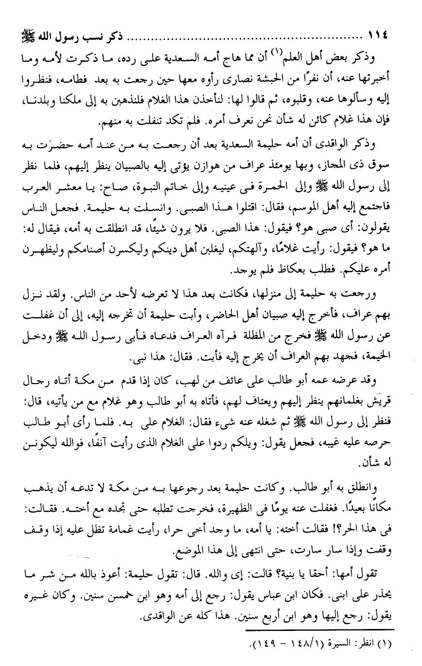 تقول أمها: أحقا يا بنية؟ قالت: إى والله. قال: تقول حليمة: أعوذ بالله من شر ما يحذر على ابنى. فكان ابن عباس يقول: رجع إلى أمه وهو ابن خمسن سنين. وكان غيره يقول: رجع إليها وهو ابن أربع سنين. هذا كله عن الواقدى.